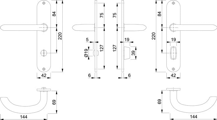 Langschild-Garnitur geprüft nach DIN EN 1906 (Gebrauchs-Kategorie Klasse 3) · Edelstahl, matt · Türgriffe mit Schnellstift-Verbindung (mit 8 mm Vollstift) für Türstärke 35 - 45 mm · Schilder sichtbar verschraubt · DIN links / rechts Entfernung 78 mm
