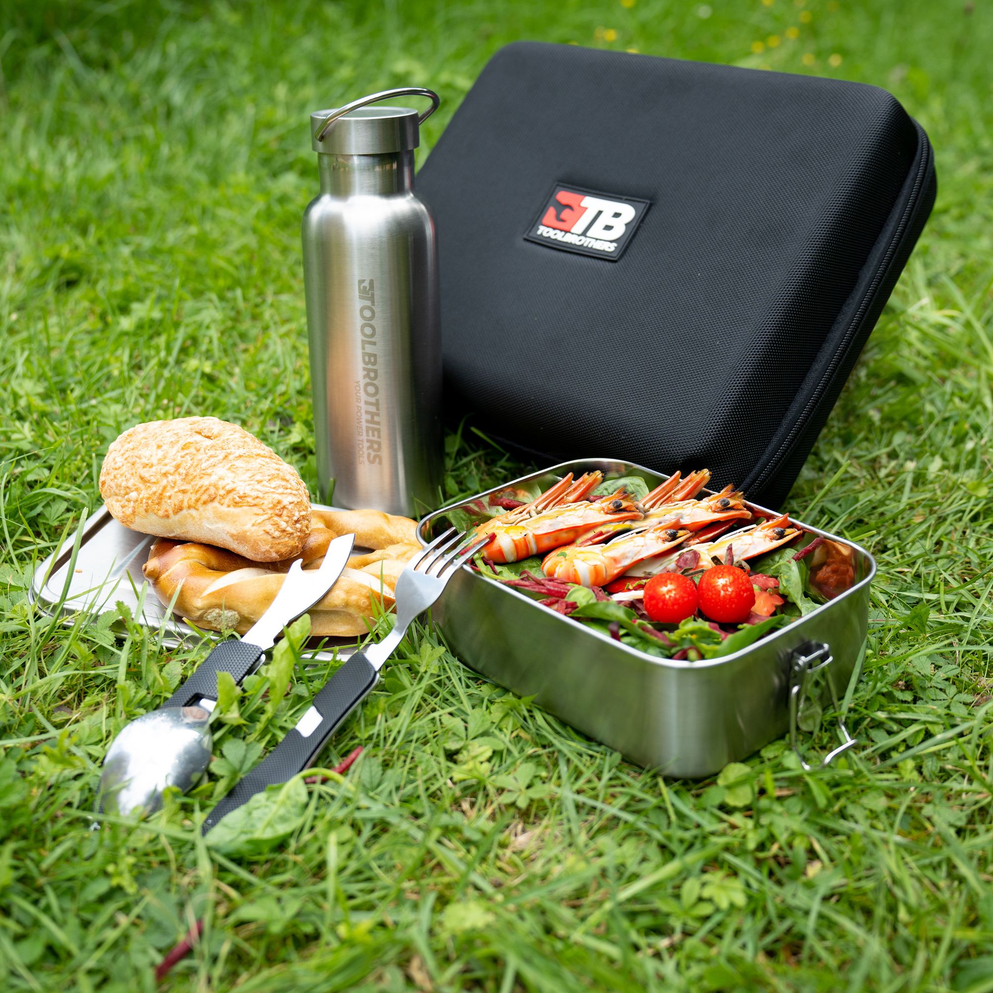 Toolbrothers Fan Lunchpaket in Hardcase Tragetasche Lunchtasche Wasserdicht mit Edelstahl Brotdose mit Trennfächern und Edelstahldeckel 1200 ml + Edelstahl Trinkflasche 600 ml + 4 in 1 Multifunktions Besteck