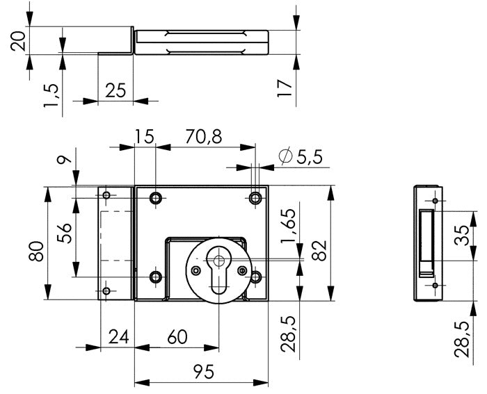 with angled striking plate - galvanised - can be used on right and left - bolt made of die-cast zinc - backset 60 mm - box width 95 mm - 2-turn