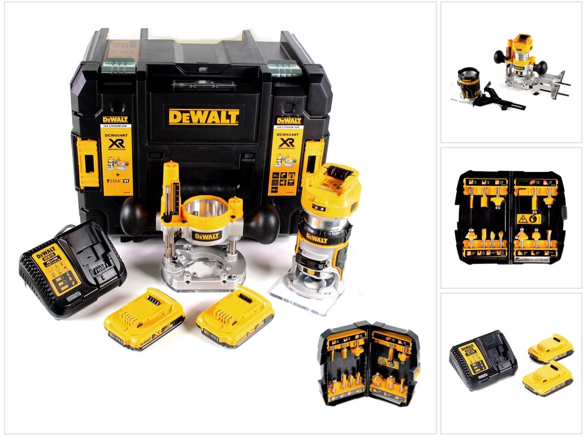 DeWalt DCW 604 D2 Akku Kombifräse 18V 55 mm + 2x Akkus 2,0 Ah + 1x Schnellladegerät + Fräser Set 12 tlg in TSTAK