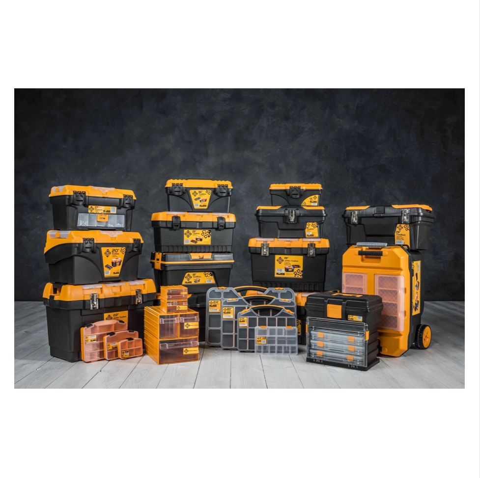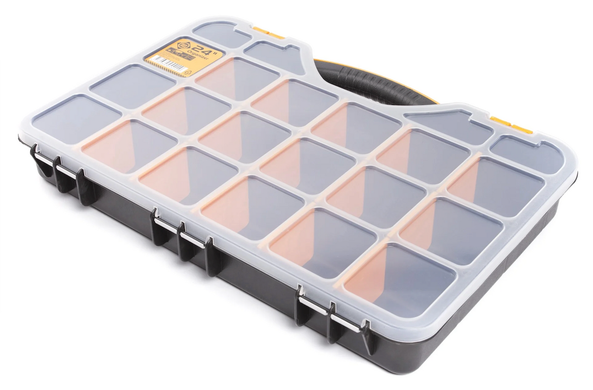 The new ORG-24 organizer from FORTE Tools is designed to bring the shop and job site closer together. Storing small parts, accessories and consumables in the variable insert boxes is safe and easy to carry. Thanks to the transparent lid, you always have a good overview of the contents of the organizer.  In addition, small parts can be sorted individually with the 18 different sized storage boxes. Discover the FORTE Tools organizer and the world of tool cases now and bring order to your workshop!