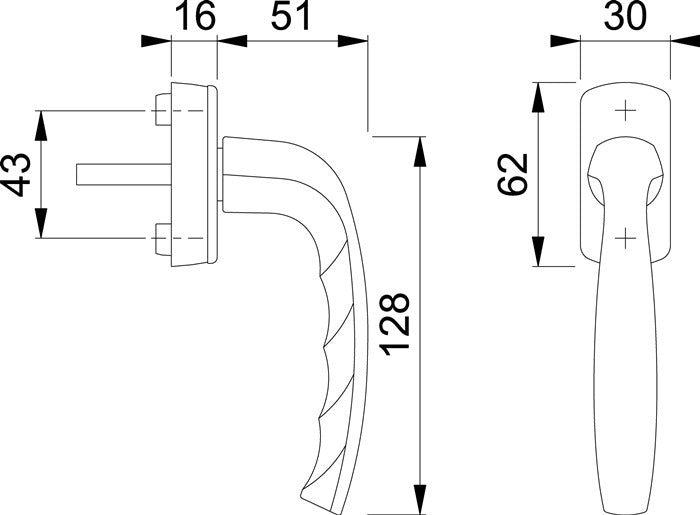 Secustik® window handle tested in accordance with RAL-RG 607/9 - meets the requirements of AhS RAL-RG 607/13 - spring-mounted, rotating cover cap - plastic rosette with support cams - 7 mm solid pin - 10 mm length variation (32-42 mm) - side catch with precise latching position - automatic locking to prevent unauthorised movement of the window fitting and twisting of the square spindle from the outside - including M5x45 mm and M5x50 mm screws
