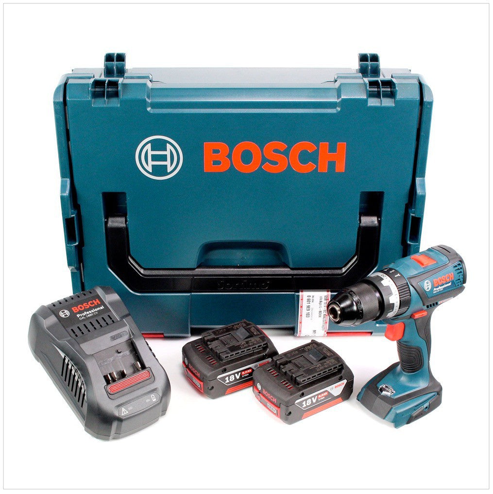 Taladro percutor inalámbrico Bosch GSB 18 V-EC (2016) con 2 baterías Li-lon GBA 5,0 Ah + cargador + L-Boxx
