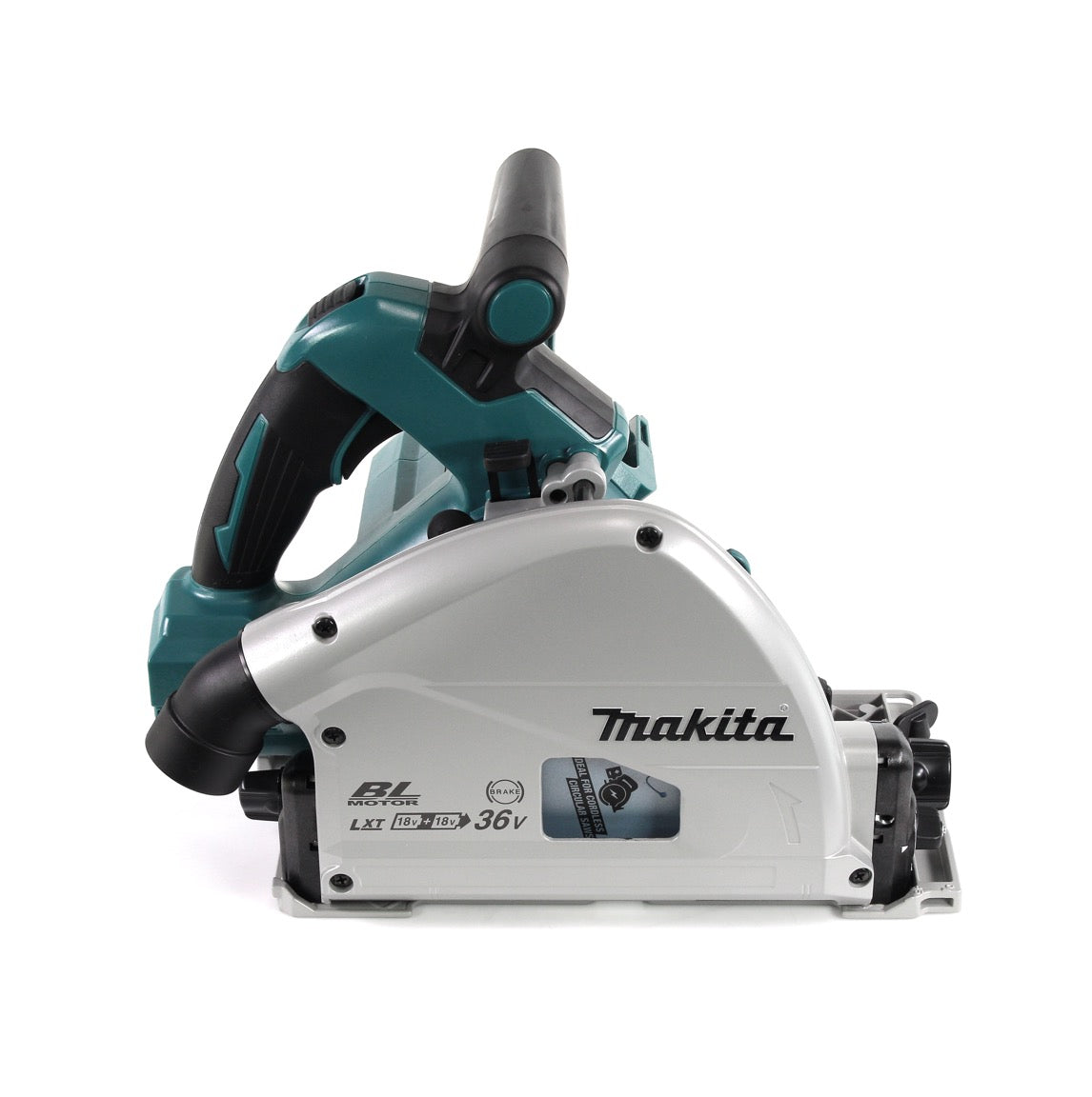 La herramienta eléctrica está diseñada específicamente para realizar cortes de inmersión. La herramienta también está destinada a cortes longitudinales y transversales de madera. Cuando se instala con una hoja de sierra circular normal, la herramienta se puede utilizar para serrar aluminio, plástico, plástico mineral y materiales similares. La sierra de inmersión con batería convence por su motor sin escobillas, que destaca por su mayor resistencia, mayor vida útil, diseño más compacto y mayor potencia. La sierra circular de inmersión tiene velocidad ajustable, electrónica constante, arranque suave y protección contra sobrecarga, que protege el motor. La sierra circular cuenta con tecnología Automatic Torque Drive durante el funcionamiento, mediante la cual la velocidad se regula automáticamente para lograr un rendimiento óptimo según los requisitos. La sierra de inmersión dispone de un ajuste rápido del ángulo de -1°, 22,5° y una preselección rápida de 45° o 48° como ángulo de inclinación máximo. El punto de intersección permanece exactamente en el mismo lugar para todos los ajustes de ángulo. El modo de marcado garantiza un corte sin desgarros. Incluso en el ángulo de inclinación más alto, el DSP 600 no se cae del carril guía. La sierra es compatible con los rieles guía Makita. La batería Makita BL 1850 B convence por su larga duración. Una ventaja adicional es el corto tiempo de carga de sólo 45 minutos en el cargador Makita. La batería tiene una vida útil máxima gracias a su baja autodescarga y protección contra cortocircuitos, sobretensión y sobrecalentamiento. El BL 1850 B también tiene un indicador LED de nivel de carga para comprobar la energía restante en la batería. El Makita DC 18 RC es un cargador rápido de baterías de iones de litio de 9,6 - 18 voltios de Makita. El cargador monitorea y controla constantemente el voltaje y la temperatura mediante un microprocesador integrado, que garantiza procesos de carga óptimos y al mismo tiempo protege las baterías mediante un control óptimo del aire de refrigeración. El cargador rápido carga la generación de baterías de 18 voltios de Makita de forma extremadamente rápida, lo que permite pausas de carga muy breves o un proceso de trabajo fluido, por ejemplo, cuando se utilizan dos baterías.