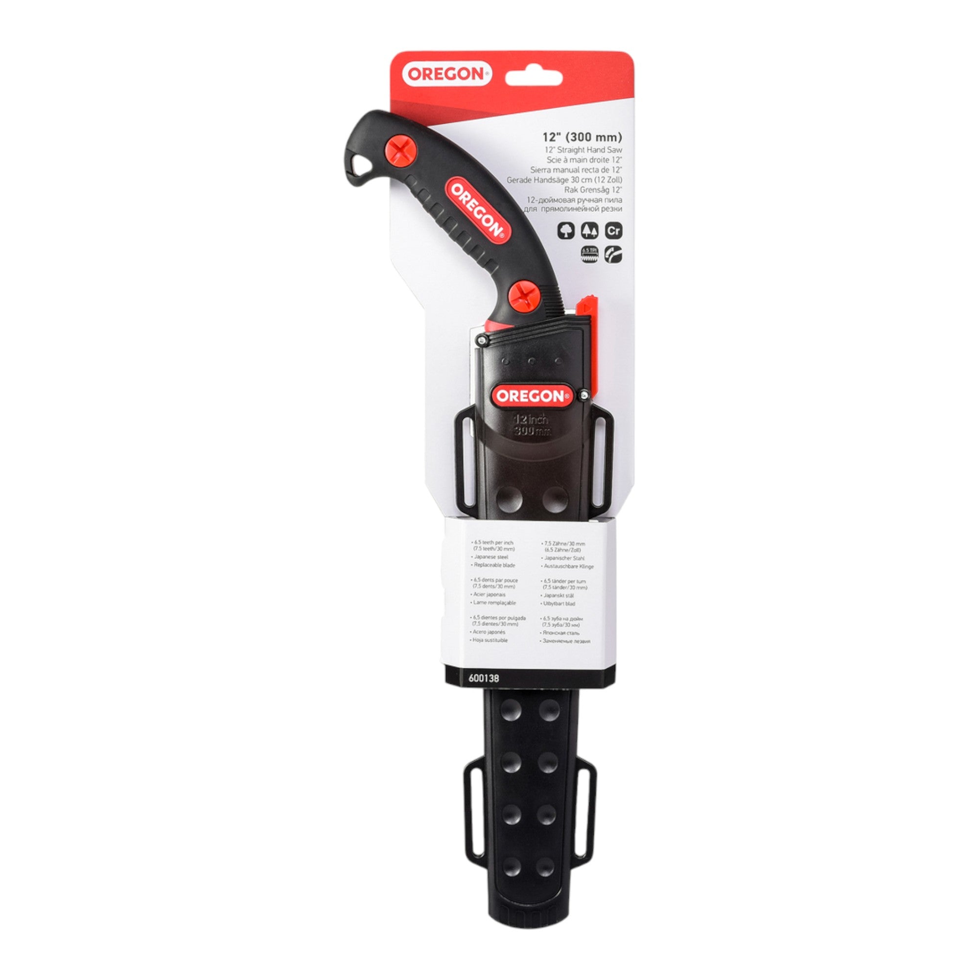 La sierra manual para poda de árboles Oregon 600138 está equipada con una hoja japonesa de alto rendimiento de 30 cm (12") de acero con alto contenido en carbono. Sus dientes de tres filos, endurecidos por impulsos, garantizan cortes suaves y limpios. La hoja cromada es intercambiable y se complementa con un mango ergonómico y resistente de polipropileno. La robusta funda con mecanismo de bloqueo, que se puede fijar con una correa o una presilla para el cinturón, garantiza la seguridad y la comodidad. Con 6,5 dientes por pulgada y un diseño templado por impulsos, la sierra manual es especialmente duradera y fiable.