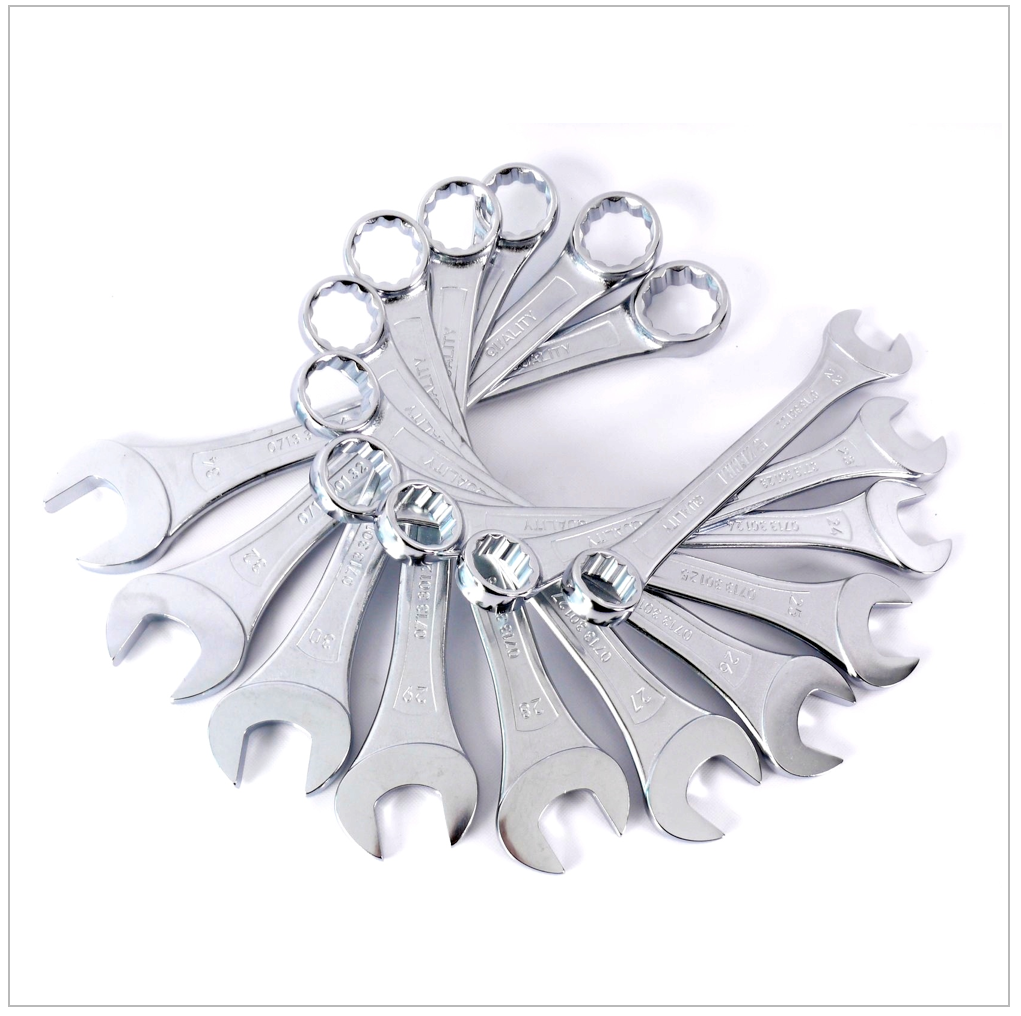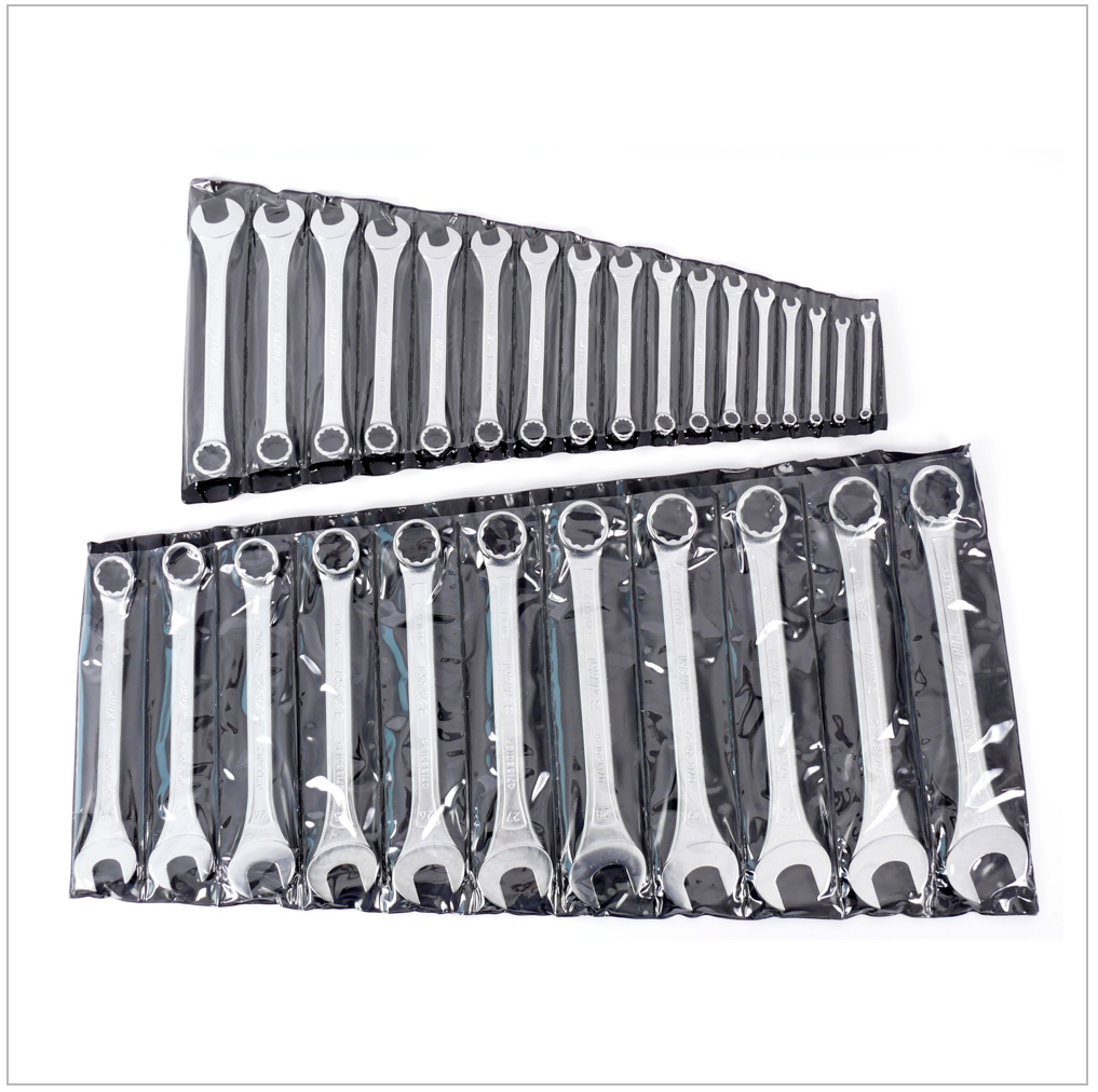 El juego de llaves combinadas de Würth, fabricado en acero al cromo vanadio y con la buena calidad habitual de ZEBRA, incluye las siguientes llaves: SW 5 1/2, 6, 7, 8, 9, 10, 11, 12, 13, 14, 15, 16, 17 , 18 , 19, 20, 21, 22, 23, 24, 25, 26, 27, 28, 29, 30, 32, 34. Las llaves se encuentran en dos prácticas bolsas enrollables de plástico que también se pueden utilizar como soporte de pared.