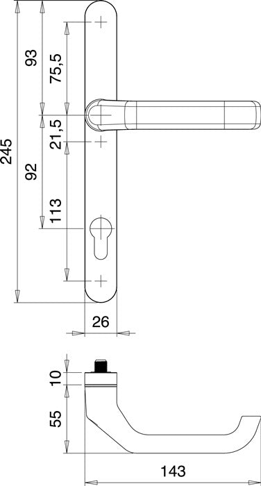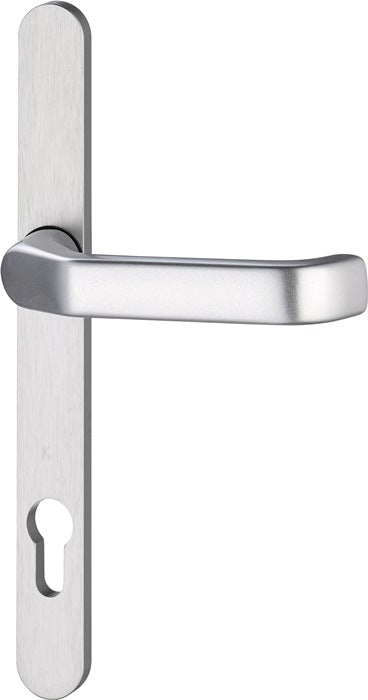 Garniture à béquilles - pour portes à cadre - distance 92 mm - carré 8 mm - PZ-perforé - béquille à rotation fixe - plaques massives - ovale - épaisseur 10 mm - hauteur 245 mm - largeur 26 mm - vissage de l'intérieur vers l'extérieur - vissage visible à l'intérieur - pour épaisseur de porte 68-73 mm - DIN gauche / droite - livraison avec tige et vis