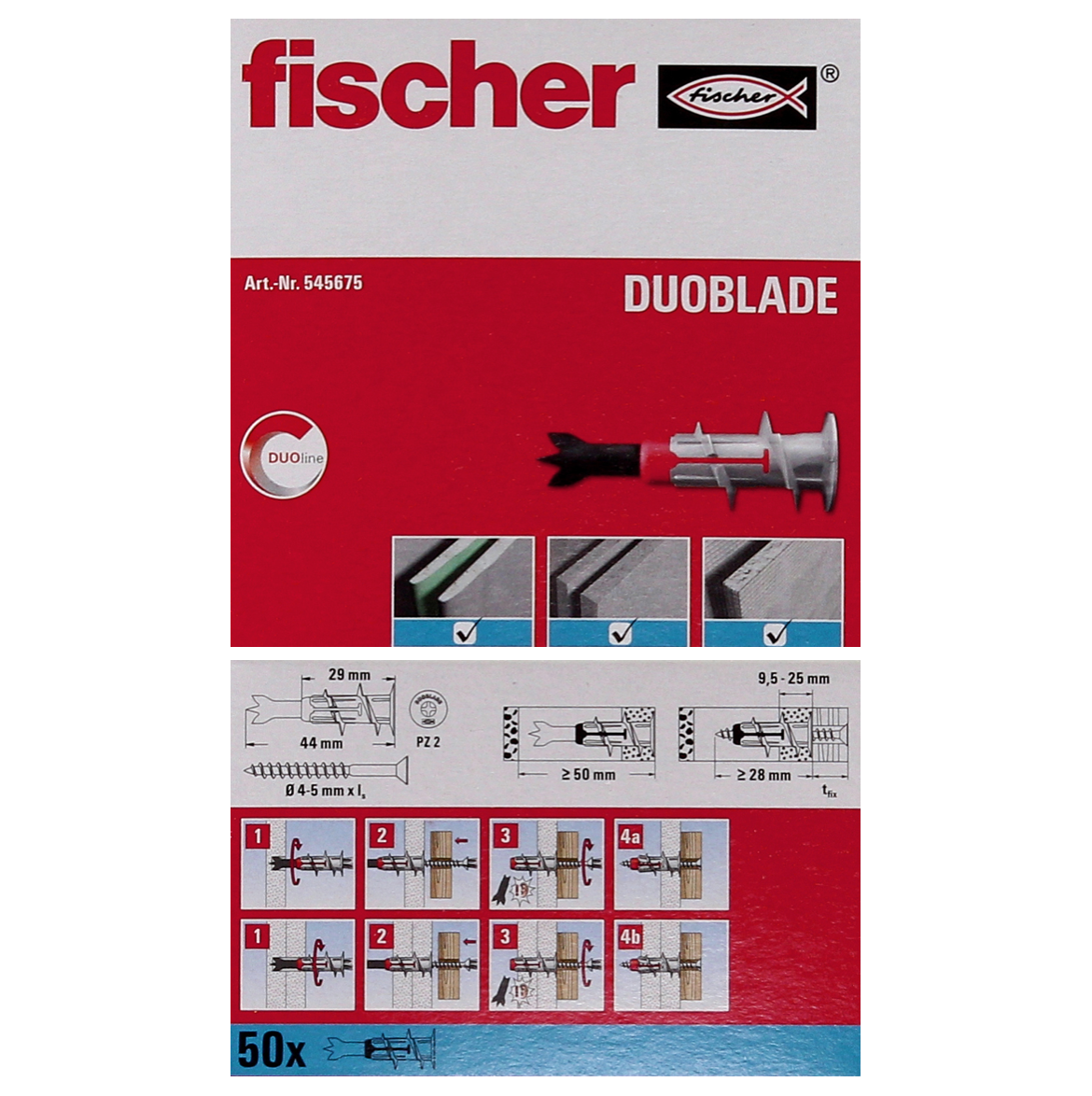 - 250x Chevilles autoforeuses Fischer DUOBLADE pour plaques de carton plâtre 44mm (5x 545675)