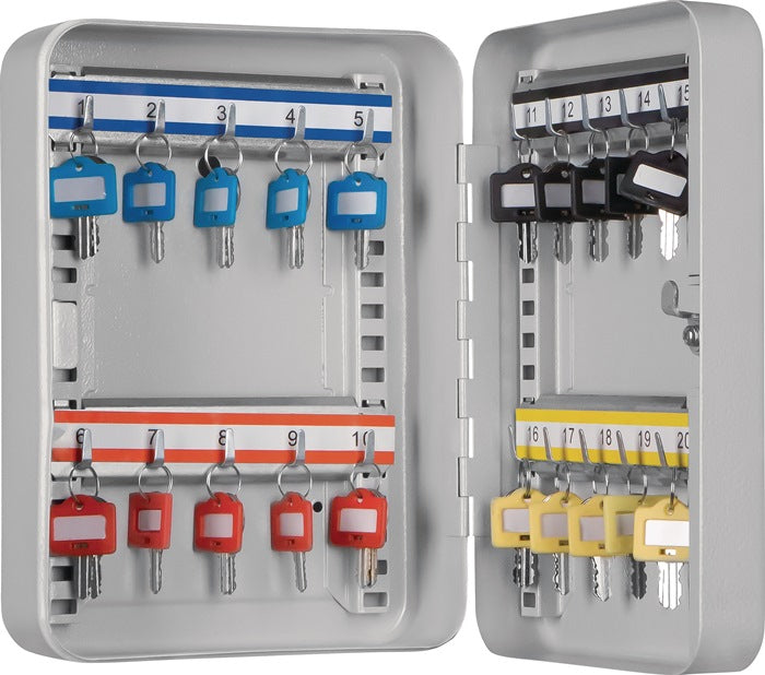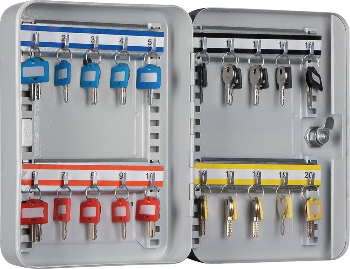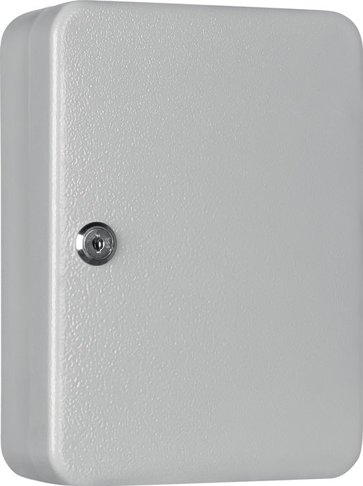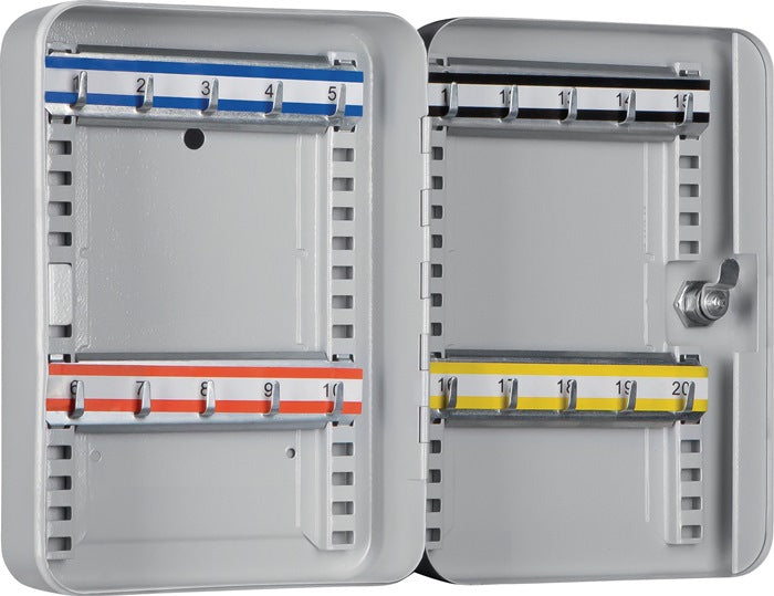 avec serrure à cylindre et 2 clés · en tôle d'acier · gris clair (RAL 7035) · pour un rangement clair des clés · montage mural possible via les trous de la paroi arrière · peut également être monté dans un meuble/armoire · les crochets sont réglables en hauteur dans une grille