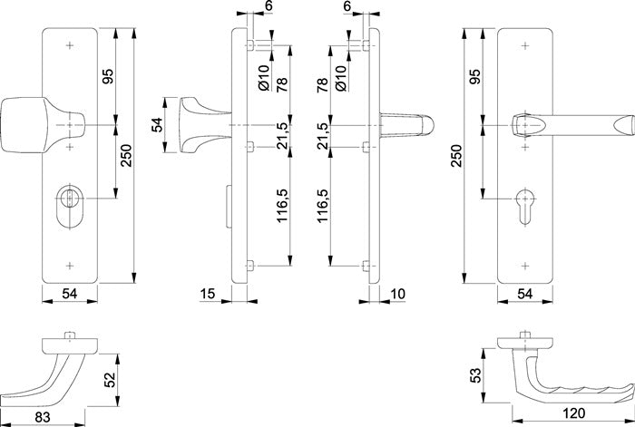 pour portes de fermeture avec ZA - testé selon DIN 18257 - sous-construction : extérieur en acier, intérieur en aluminium, cames d'appui - garnitures interchangeables avec bouton coudé - cache-cylindre : acier trempé, pour longueur de cylindre en saillie 10-18 mm - assemblage par goupille profilée HOPPE FDW - perforation PZ - classe de résistance ES 1 - fixation : invisible, traversante, vis filetées M6