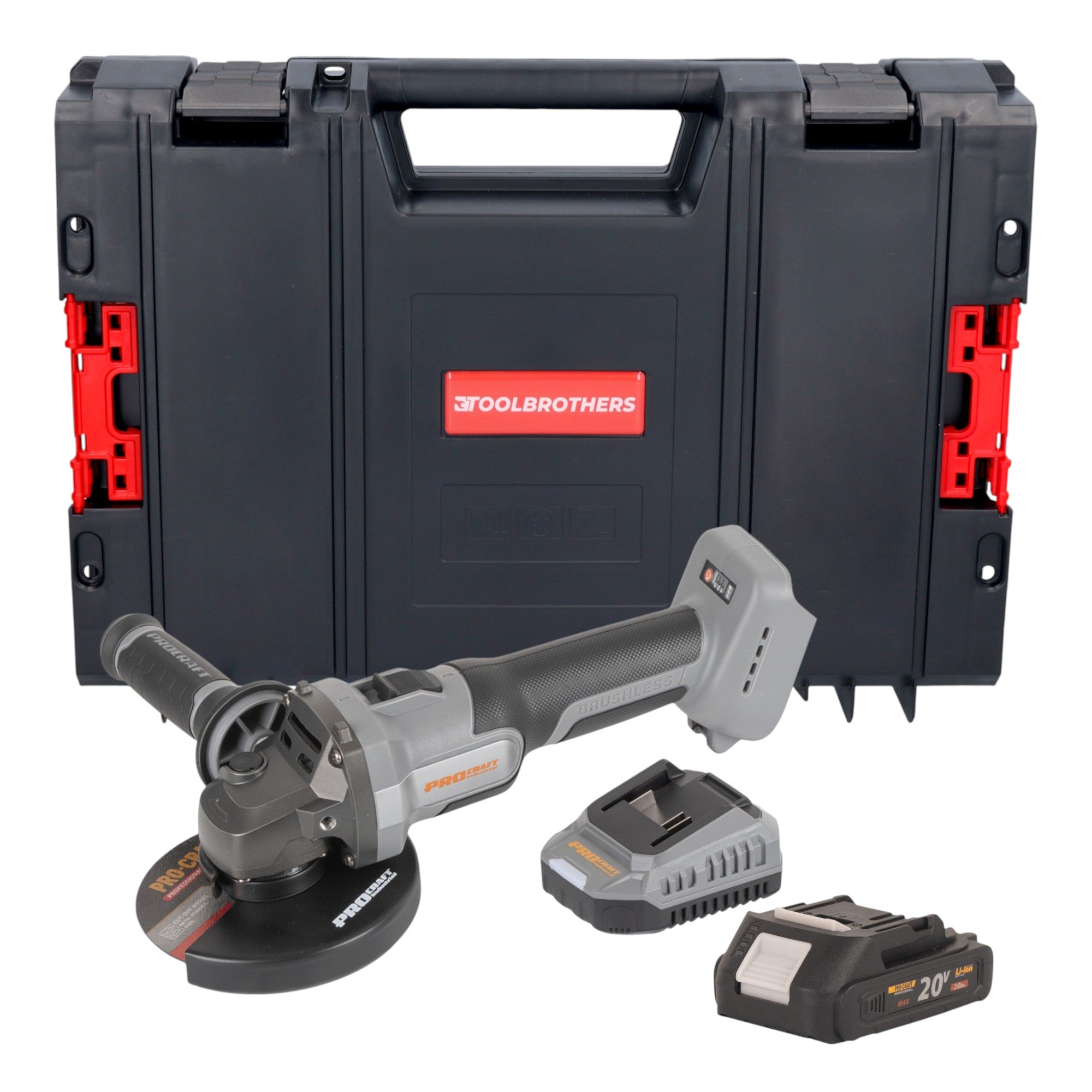 Procraft Industrial AG125Abb Meuleuse d'angle sans fil 20 V 125 mm Brushless + 1x batterie 2,0 Ah + chargeur + boîte à outils RHINO