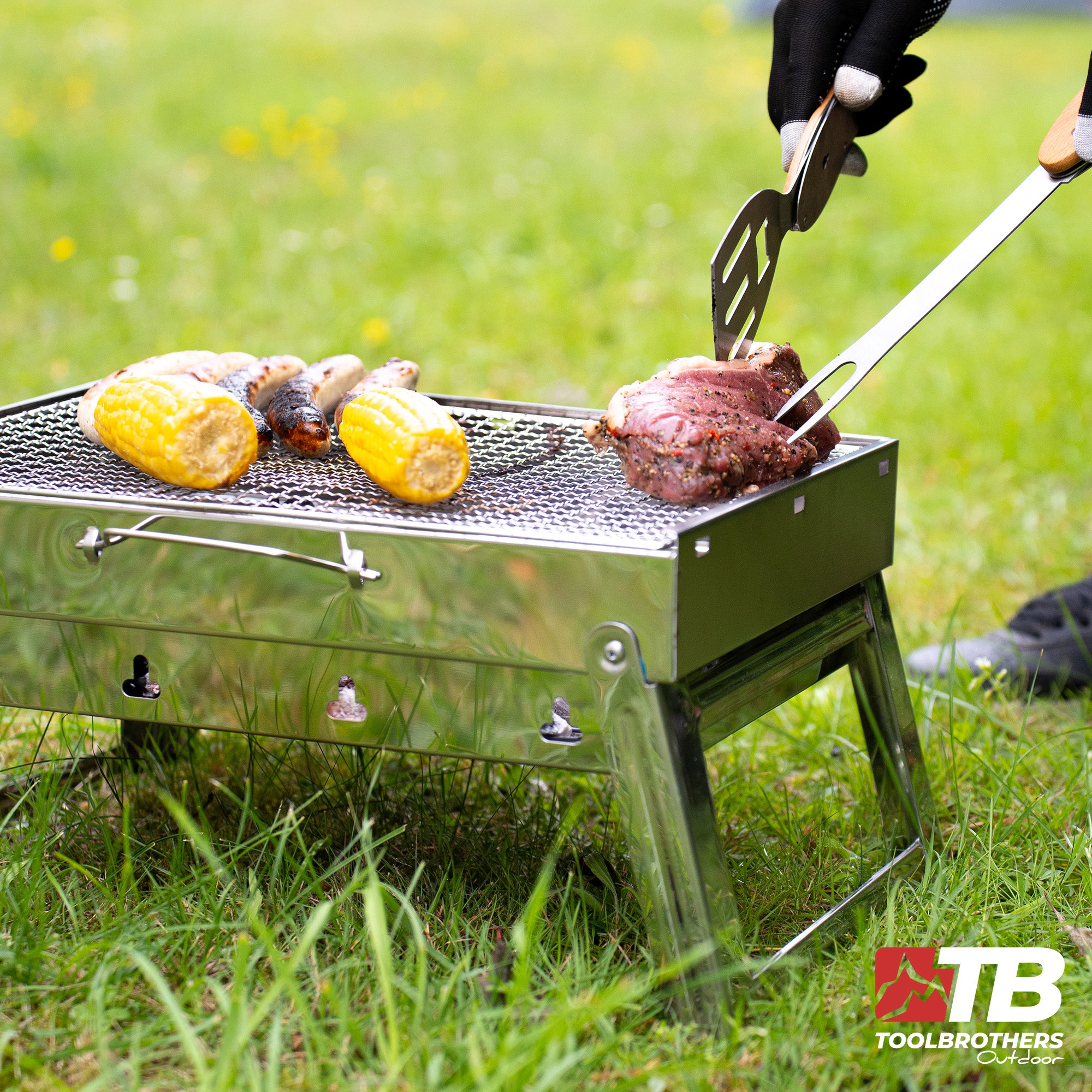 Toolbrothers Outdoor Multitool Grill, ustensiles de barbecue en acier inoxydable avec fourchette, cuillère à barbecue, grille à viande, décapsuleur et tire-bouchon 5 pcs.