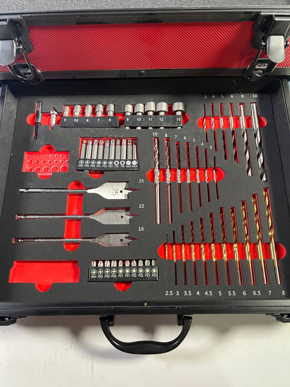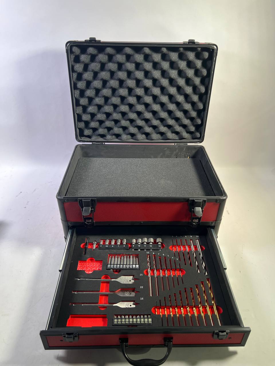 Toolbrothers TX Coffret de transport en aluminium rouge pour visseuse à percussion et Perceuse visseuse à percussion sans fil + Set de forets, 70 pcs. + Insert cubique en mousse