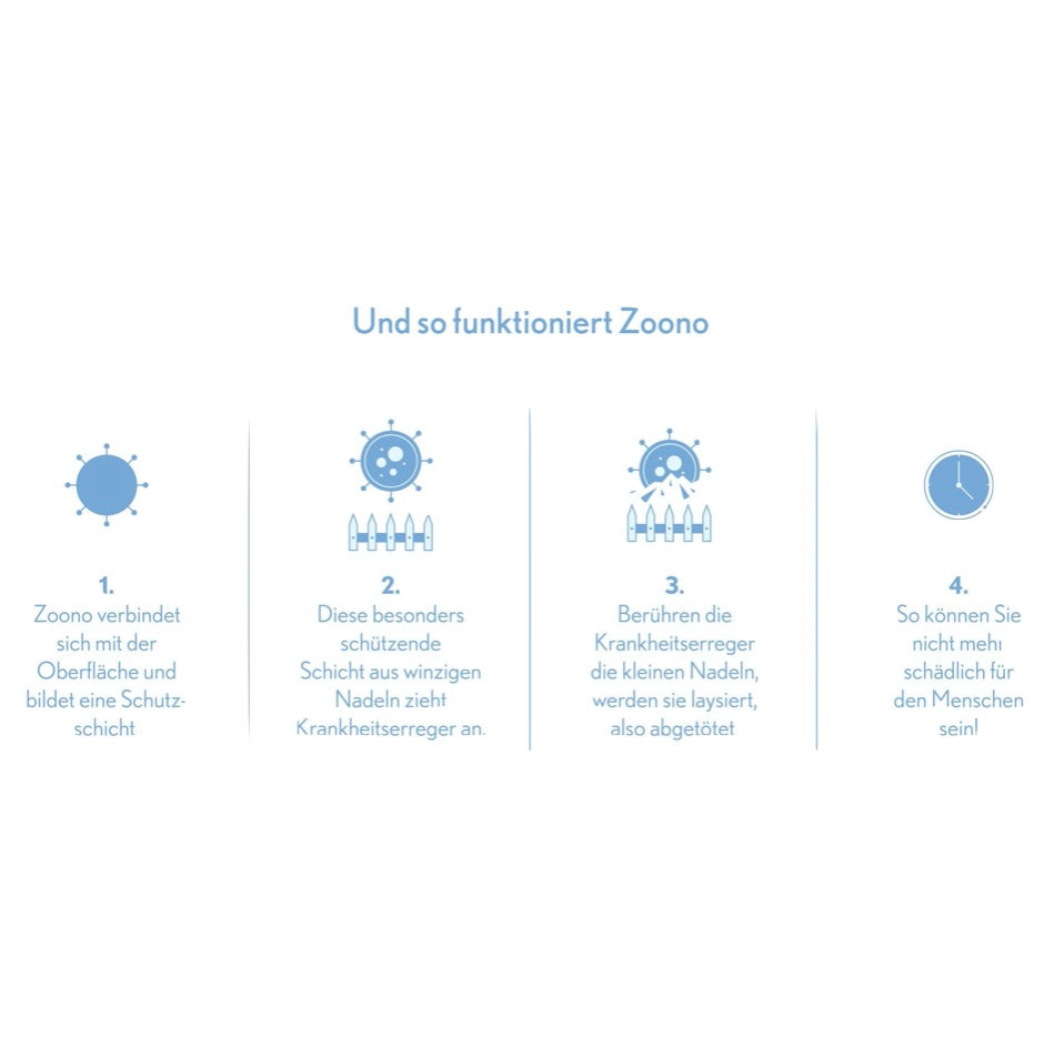 Le désinfectant de surface Zoono possède une technologie qui détruit mécaniquement les germes et met ainsi à l'ombre les produits antimicrobiens. La plupart des désinfectants sont à base d'alcool et d'autres produits chimiques et ne sont donc pas bons pour les surfaces, le corps et la peau. Le désinfectant de surface Zoono, quant à lui, est à base d'eau, inodore et doux pour les humains et les animaux. Le film monomoléculaire sur la surface qui se forme lors de l'utilisation du désinfectant de surface est constitué de polymères antimicrobiens à base de silane. Ces polymères se lient de manière covalente à la surface, formant une barrière de « broches » chargées positivement. Grâce à la charge positive, les agents pathogènes sont attirés et détruits mécaniquement en traversant la paroi cellulaire. Les épingles restent sur les surfaces pendant 15 jours. Qu'il s'agisse de poignées de porte, de robinets ou de tout point de contact de la vie quotidienne, Zoono peut être utilisé n'importe où. De nos jours, la prévention vaut mieux que le suivi, et le désinfectant de Zoono peut aider ici.