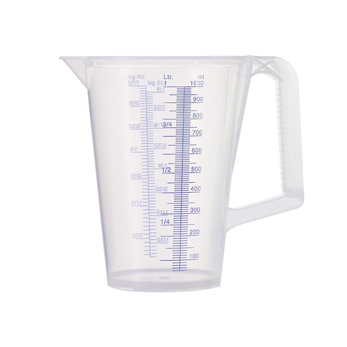 in polipropilene - scala in rilievo, stampata in blu, in MI e GAL su ciascun lato del misurino - manico ergonomico con scanalature per una migliore presa - resistente a sostanze neutre, oli, acidi e alcol - privo di BPA - sicuro per gli alimenti in conformità con (UE) n. 20/2011 e FDA § 21 CFR 177.1520