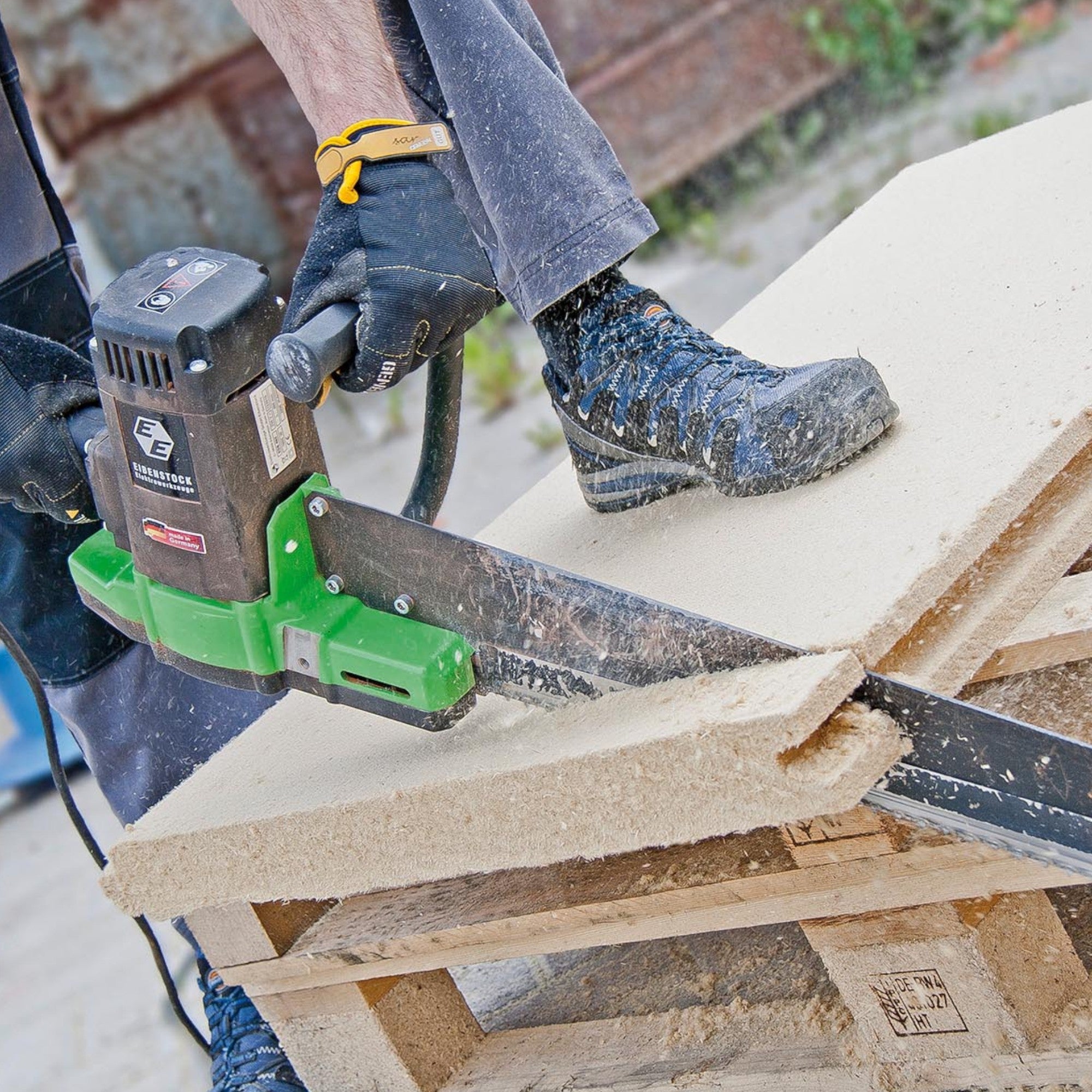 Die Eibenstock EDB 480.1 Doppelblattsäge ist ein leistungsstarkes und flexibles Werkzeug, das speziell für das Schneiden von Hochlochziegeln, Porenbeton, Holz sowie druckfesten Dämmstoffen entwickelt wurde. Im Vergleich zu schwer transportierbaren Ziegelsägen ermöglicht diese Säge eine schnellere und kostensparendere Trennung von Hochlochziegeln, wodurch sie sich besonders für den Einsatz im Hoch- und Tiefbau, Trockenbau sowie in Zimmereien eignet. Mit dieser Säge lassen sich problemlos Ausklinkungen herstellen und Planziegel passgenau zuschneiden. Der leistungsstarke 1.800 W Motor sorgt für eine hohe Schnittgeschwindigkeit und eine lange Standzeit, was die Säge zu einem zuverlässigen Partner für zahlreiche Anwendungen macht. Die robuste, verwindungssteife Schwertkonstruktion sorgt für präzises Schneiden, während die zwei gegenläufig arbeitenden Sägeblätter ein rückschlagfreies Sägen ermöglichen, was die Sicherheit während der Arbeit erhöht. Besonders praktisch ist die Gebläse-Funktion, die sowohl das Getriebe als auch den Anwender vor Staub schützt und für eine saubere Arbeitsumgebung sorgt. Mit einer kompakten und schlanken Bauform ist die Säge besonders handlich und ermöglicht randnahes Arbeiten. Der ergonomische Handgriff kann an zwei Seiten montiert werden, was die Handhabung noch flexibler und komfortabler macht.