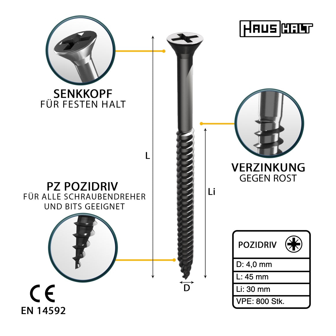 - 800x viti universali per legno HausHalt 4,0 x 45 mm PZ2 (2x 000051371117)