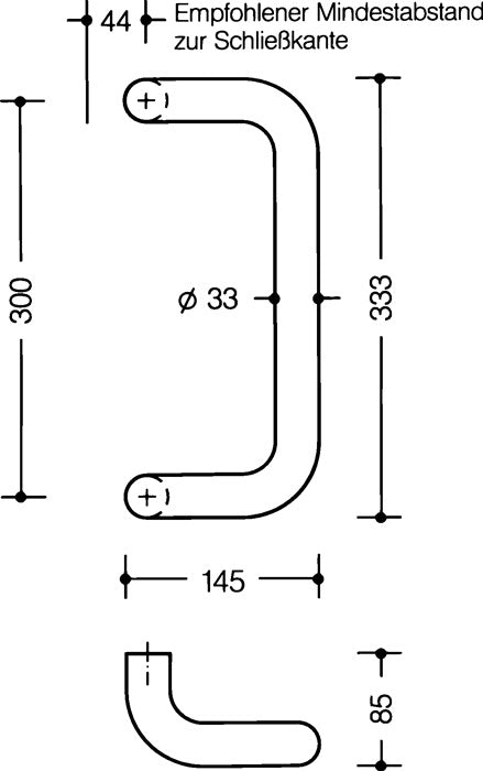 Stoßgriff System 111 · Winkelgriff in gebogener Form ausgeführt, mit gerader Anbindung · zur Montage vorgerichtet für Blatt-Türen · Achsmaß 300 mm · aus durchgefärbtem, mattem Polyamid · Durchmesser 33 mm · für einseitige und paarweise Befestigung · Ausführungsvorschlag! Bitte alle Maße und baulichen Gegebenheiten im Auftragsfall prüfen!