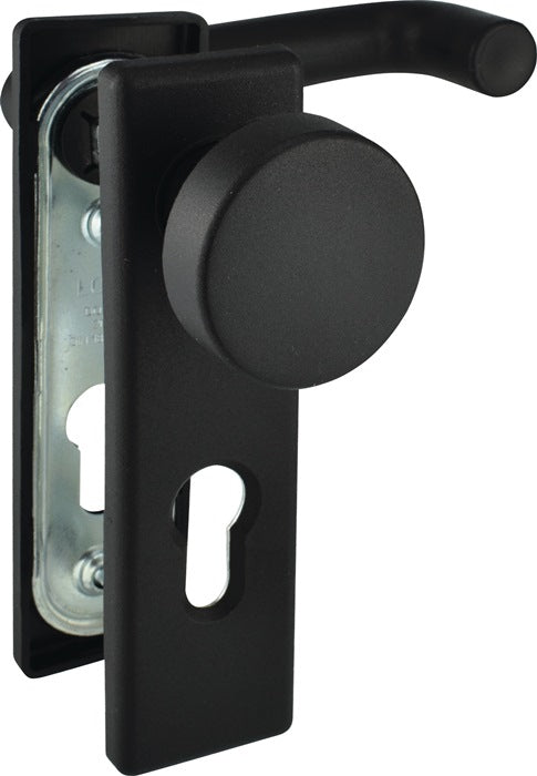 testato secondo DIN 18273 - con 2 viti di fissaggio - perforazione PZ - distanza 72 mm - quadro 9 mm - maniglia a leva fissa/girevole - piastre di fondo in acciaio e coperture in plastica - inclinazione - per porte di spessore 40-66 mm - utilizzabile DIN sinistra/destra - colore nero