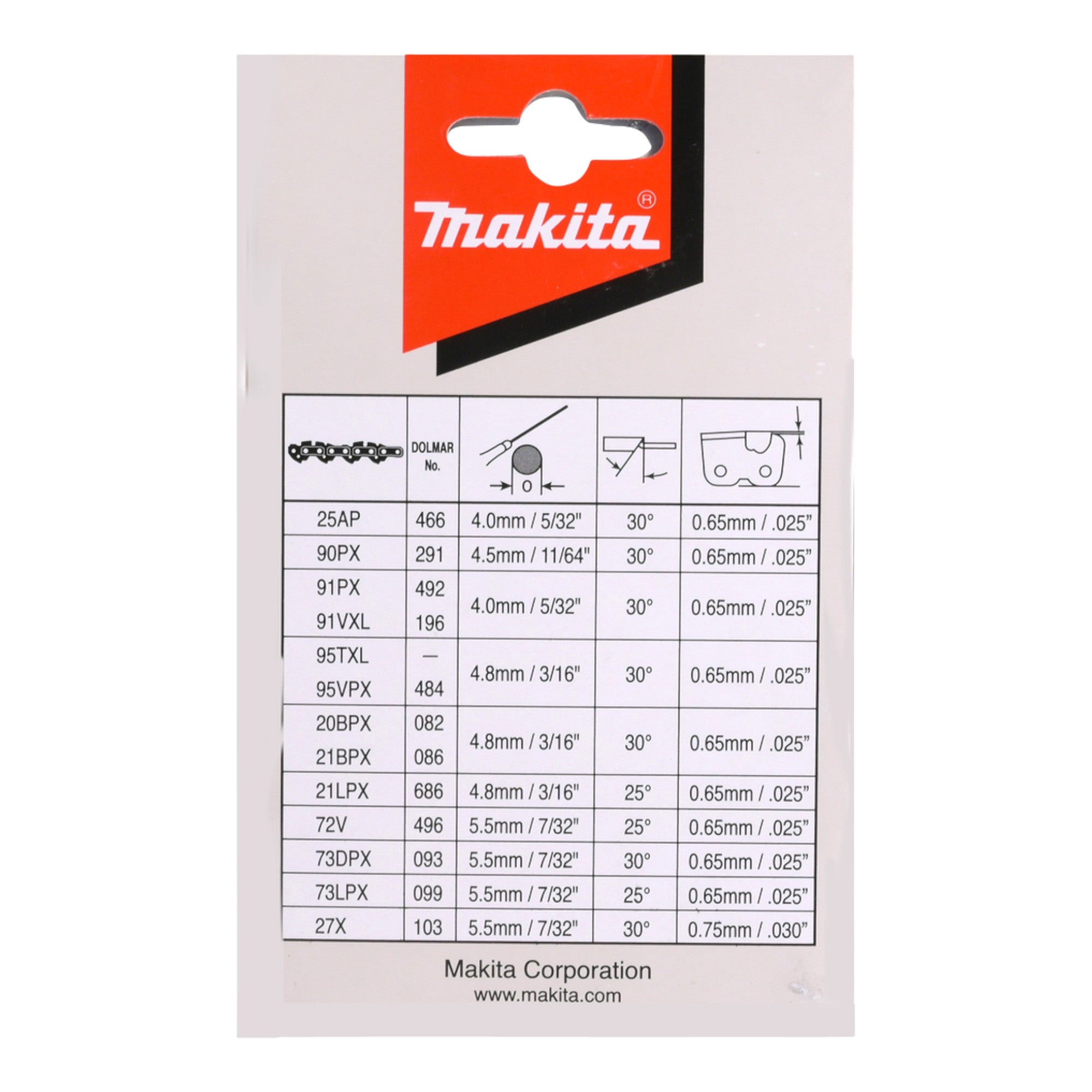 Die Makita Sägekette 90PX mit einer Länge von 40 cm überzeugt durch ihre hohe Effizienz und geringe Rückschlagneigung. Sie ist speziell für Sägeschienen mit einer Nutbreite von 1,1 mm und einer Teilung von 3/8" ausgelegt. Die besonders schmale Nutbreite trägt dazu bei, die Schnittleistung zu steigern und den Energieverbrauch zu reduzieren – ideal für akkubetriebene Kettensägen. Ausgestattet mit „Chamfer“-Halbmeißel-Schneiden, die über doppelte Schneidecken verfügen, liefert die Sägekette ein grobes, aber effektives Schnittbild. Sie zeichnet sich durch eine hohe Haltbarkeit aus und lässt sich zudem einfach nachfeilen, was die Wartung erleichtert und die Lebensdauer verlängert. Damit eignet sie sich hervorragend für Anwender, die Wert auf eine robuste, leistungsstarke und wartungsfreundliche Sägekette legen.