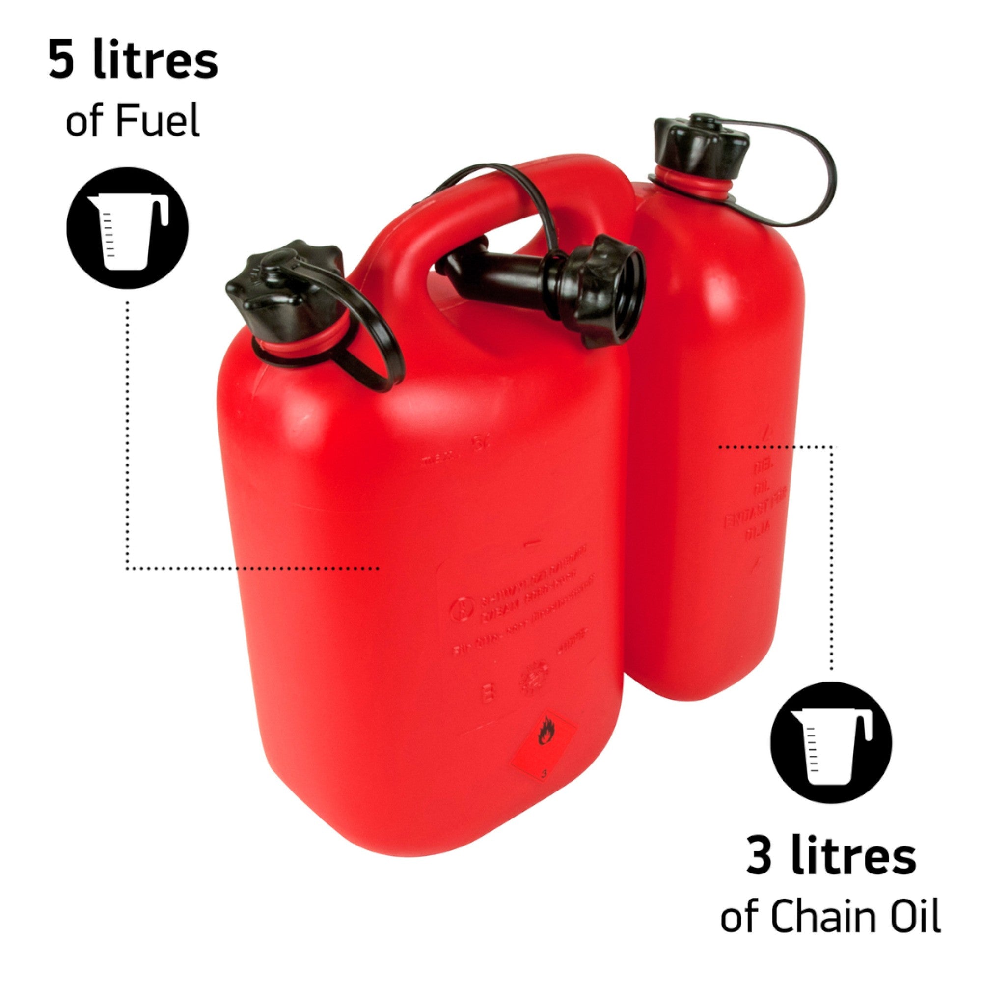 Dieser hochwertige Kombikanister bietet Platz für 5 Liter Kraftstoff und 3 Liter Kettenöl und ist damit ideal für den praktischen Einsatz bei Forst- und Gartenarbeiten. Beide Kanister verfügen über eine Messskala, die das Ablesen des Füllstands erleichtert. Dank seiner leichten und widerstandsfähigen Bauweise sowie dem großen Griff lässt sich der Kanister auch mit Arbeitshandschuhen bequem transportieren. Zudem ist er wahlweise auch in einer transparenten Ausführung erhältlich.