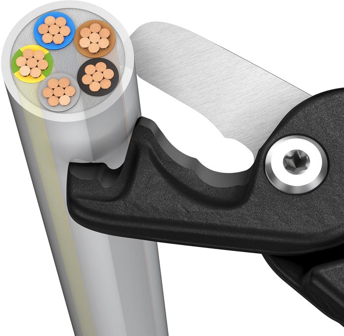 Izolacja VDE do 1000 V - wyprodukowane wg. DIN EN/IEC 60900, testowane na sztuki - z przegubem elektrycznym - długie nogi i zoptymalizowane krawędzie tnące: do 60% łatwiejsze cięcie niż w przypadku kompaktowych nożyc do kabli - ogromna wydajność: tnie lite kable miedziane lub aluminiowe do 35 mm² - kable splatane do 70 mm² i kable elastyczne do 120 mm² - dwa obszary cięcia: stopniowana główna krawędź tnąca zawsze utrzymuje mniejsze i większe kable jak najbliżej złącza podczas cięcia - przednia krawędź tnąca służy do stopniowego cięcia ("skubania") bardzo dużych kabli - wygodna obsługa jedną i dwiema rękami nawet przy dużych średnicach kabli dzięki zminimalizowanej szerokości nóg - śrubowy przegub napędowy: wysoka przekładnia - płynna praca - regulowana - wąska głowica dla lepszej dostępności - z zabezpieczeniem przed przytrzaśnięciem dla bezpiecznej pracy - nie nadaje się do kabli wzmocnionych stalą, takich jak ACSR - krawędzie tnące dodatkowo hartowane laserowo - twardość krawędzi tnących ok. 56 HRC