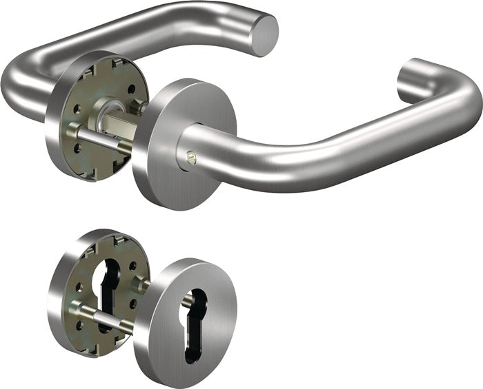 Feuerschutz-Rosetten-Garnitur · DIN links / rechts · Vierkant 9 mm · Drückergarnitur = beidseitig Drücker / Wechselgarnitur = außen Knopf 3020 · für Türstärke 38-63 mm Lieferung als Komplettgarnitur