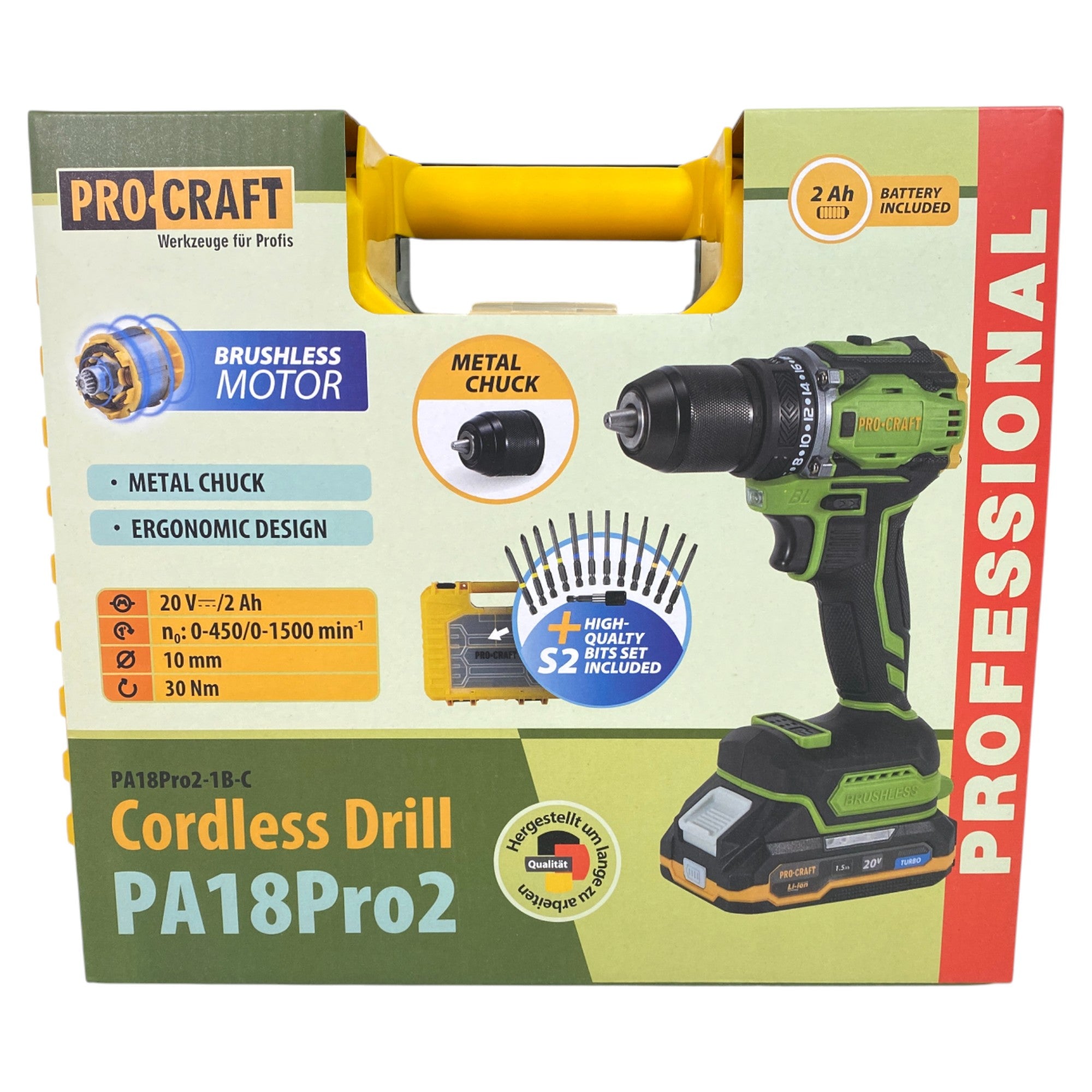 Procraft PA18Pro2-1B-C akumulatorowa wiertarko-wkrętarka 20 V 30 Nm bezszczotkowa + 1x akumulator 2,0 Ah + ładowarka + 13-częściowy zestaw bitów + walizka