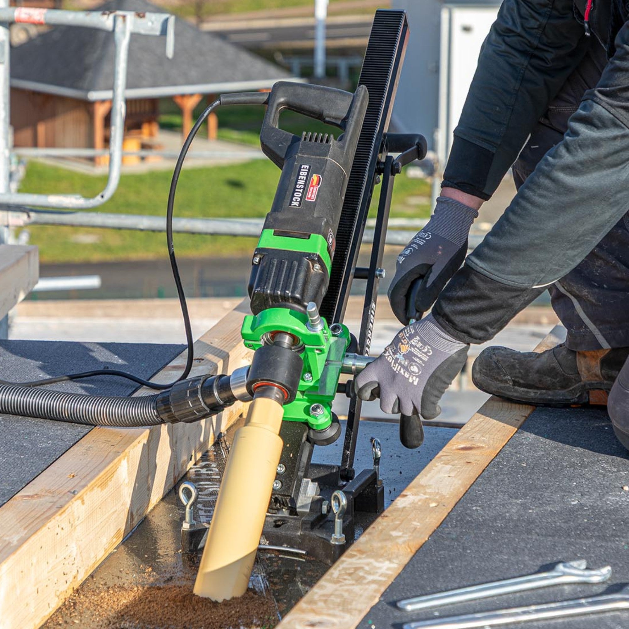 Die Eibenstock EHD 1801 Diamant Trockenkernbohrmaschine ist ein leistungsstarkes Werkzeug, das für das Trockenbohren in großen Bohrdurchmessern bis zu 250 mm in harten Materialien wie Kalksandstein, Mauerwerk, Klinker, Ziegel und Keramik ausgelegt ist. Sie eignet sich perfekt für Anschlussbohrungen im Kamin- und Heizungsbau sowie das Herstellen von Wand- und Deckenöffnungen im Sanitär-, Heizungs- und Lüftungsbau. Der leistungsstarke Motor sorgt für eine schnelle und präzise Ausführung der Arbeiten, während die Elektronik mit Funktionen wie Sanftanlauf sowie Temperatur- und Überlastabschaltung für eine lange Lebensdauer und zusätzliche Sicherheit sorgt. Das Ölbadgetriebe garantiert eine optimale Schmierung und trägt zur Langlebigkeit der Maschine bei, während das robuste Metallgetriebe für eine hohe Widerstandsfähigkeit sorgt. Eine mechanische Sicherheitskupplung schützt vor plötzlichen Überlastungen und sorgt für einen sicheren Betrieb. Der variabel verstellbare Zusatzhandgriff am Spannhals ermöglicht eine bequeme Handhabung und eine exakte Führung der Maschine, während die kompakte Bauweise dafür sorgt, dass die EHD 1801 sowohl handlich als auch ausgewogen ist, um auch in schwierigen Arbeitsbereichen maximale Präzision und Kontrolle zu bieten.