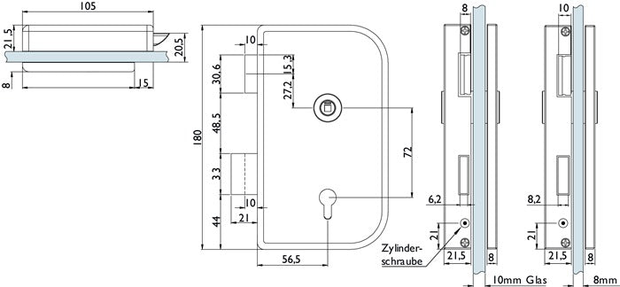 Grundschloss geprüft nach DIN EN 18251 Klasse 3 · Flüsterfalle · 2-geteilte Spezial-Klemmnuss · verschraubte Schlossabdeckungen aus Edelstahl · Zubehörbeutel mit Drückerführung 16 + 18 mm inkl. Abdeckungen in Schlossfarbe · bei diesem Schlosstyp ist die Angabe links oder rechts erforderlich 7 · für 8 mm Glasstärke Lieferung ohne Drücker und Bänder – bitte separat bestellen!