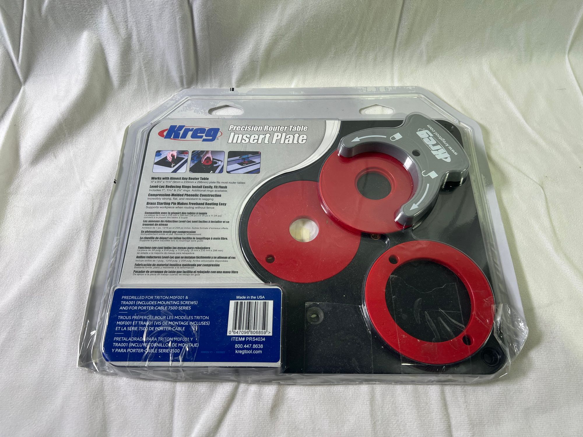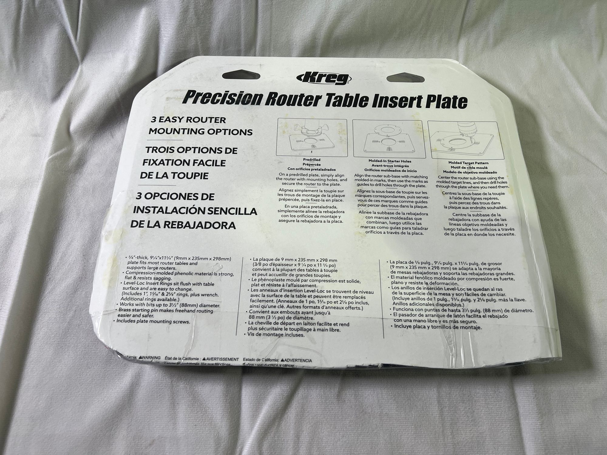KREG PRS4034 Frästisch Einlegeplatte vorgebohrt 298 x 235 x 9 mm + 3x Reduzierring 25 mm / 30 mm / 67 mm - OVP Beschädigt