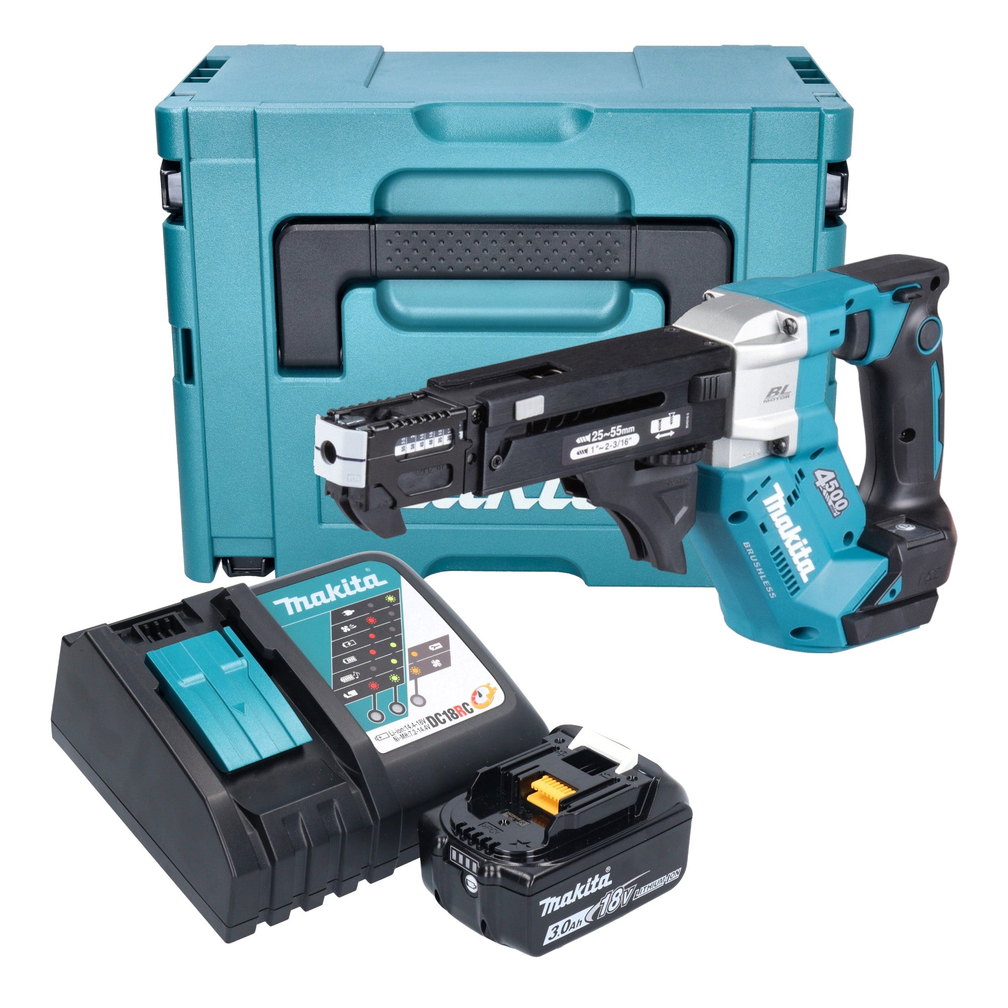 Makita DFR 552 RF1J Akku Magazinschrauber 18 V 25 - 55 mm Brushless + 1x Akku 3,0 Ah + Ladegerät + Makpac