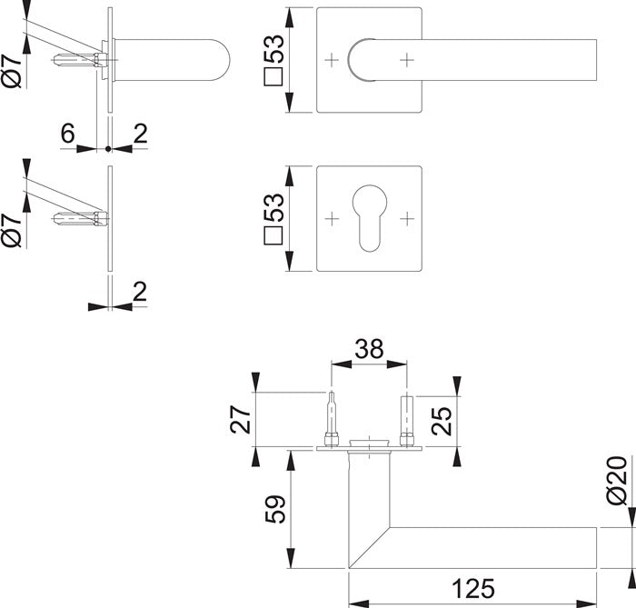 mit Schlüsselrosetten für Innentüren · geprüft nach DIN EN 1906: 37-0140U, Objekt-Garnitur · F9714M schwarz matt · Vierkant 8 mm · TS = 35 - 45 mm Lagerung: Türgriffe lose, wartungsfreie Gleitlager Verbindung: HOPPE-Schnellstift mit HOPPE-Vollstift (Stift-/Lochteil) Befestigung: aufsteckbare Griffrosetten mit Stütznocken, aufsteckbare Schlüsselrosetten mit durchgehenden Stütznocken schraubenlose Montage, 2 mm flache Rosetten