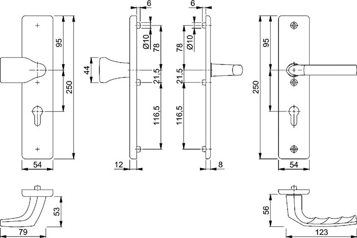Wechselgarnitur für Abschlusstüren · Zamak-Unterkonstruktion im Außen- und Innenschild · mit feststehendem Knopf · Profilstift-Verbindung · sichtbare Verschraubung · Lochung PZ · Außenschild-Randhöhe 12 mm · Aluminium · Randhöhe Schild: 12 mm · Wechselgarnitur · DIN links / rechts · Widerstandsklasse ES 0