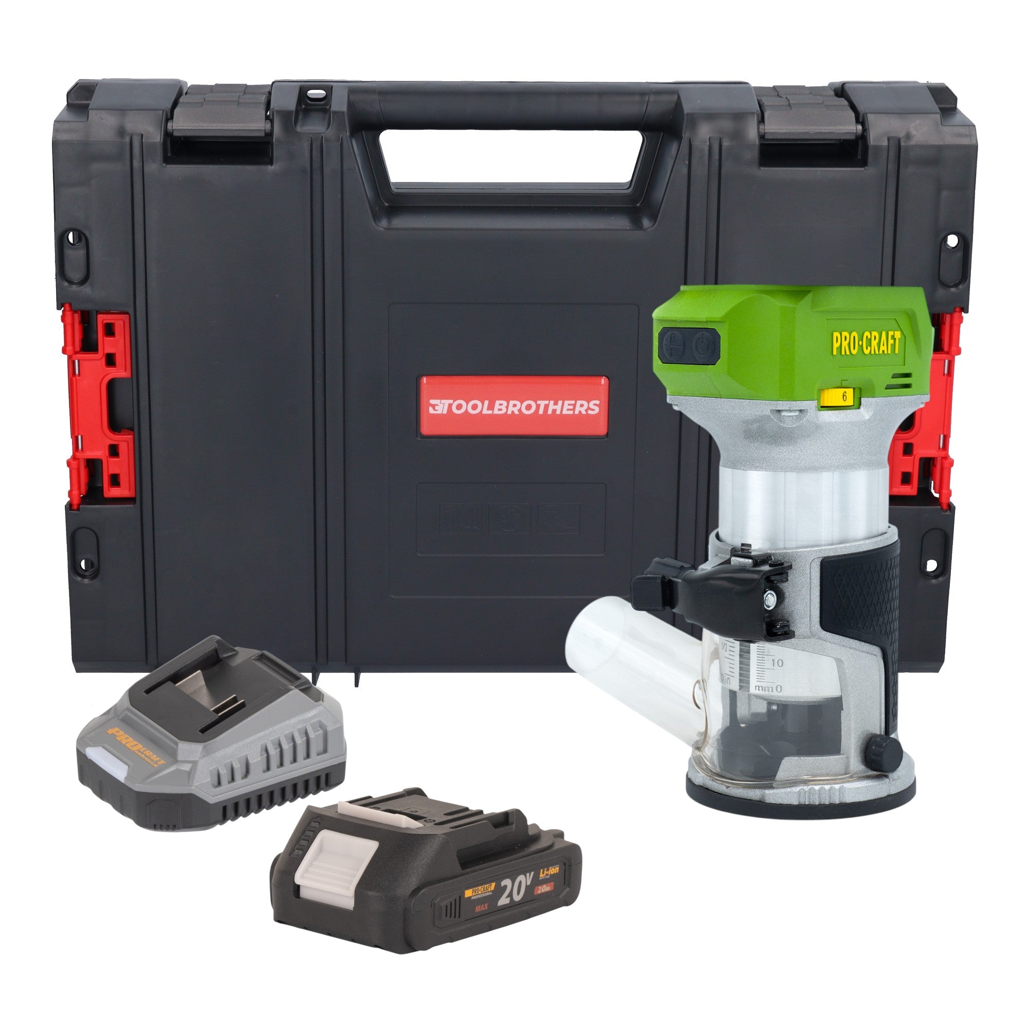 Procraft POB24bb Akku Multifunktionsfräse 20 V 6 / 8 mm Brushless + 1x Akku 2,0 Ah + Ladegerät + RHINO Toolcase