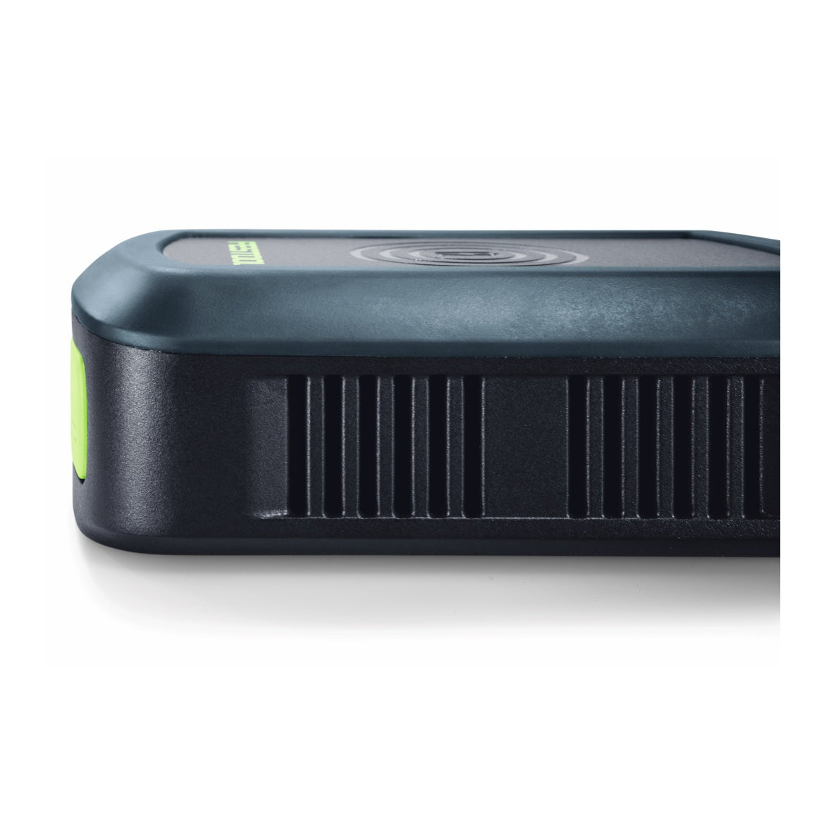 Dieser Ladeadapter von Festool verwandelt einen 18 V Akku in eine mobile Smartphone Ladestation. Der Adapter ist mit allen 18 V Akkus, bis auf das 3,1 Ah Ergo Akkupack, kompatibel. Es können bis zu Drei Akkus gleichzeitig geladen werden. So gibt es einen USB-A Anschluss, einen USB-C Anschluss und eine Induktions-Ladestelle. Für die Induktionsladung muss das Smartphone Qi-BPP bzw. PPDE fähig sein. Der Adapter ist robuster als eine herkömmliche Powerbank und ist daher perfekt für den Arbeitsalltag geeignet. Er ist wie die 18 V Akkupacks konzipiert. Die gummierte Oberfläche sorgt für einen sicheren Halt beim induktiven Laden von Smartphones. Dadurch, dass der Adapter gerade einmal so groß wie ein 3,1 Ah Compact Akkus ist, kann er platzsparend in einem Systainer verstaut und überall hin mitgenommen werden. Festool ist ein führender Hersteller von Elektrowerkzeugen, eine lange Tradition und eine exzellente Verarbeitung zeichnen das Unternehmen aus.