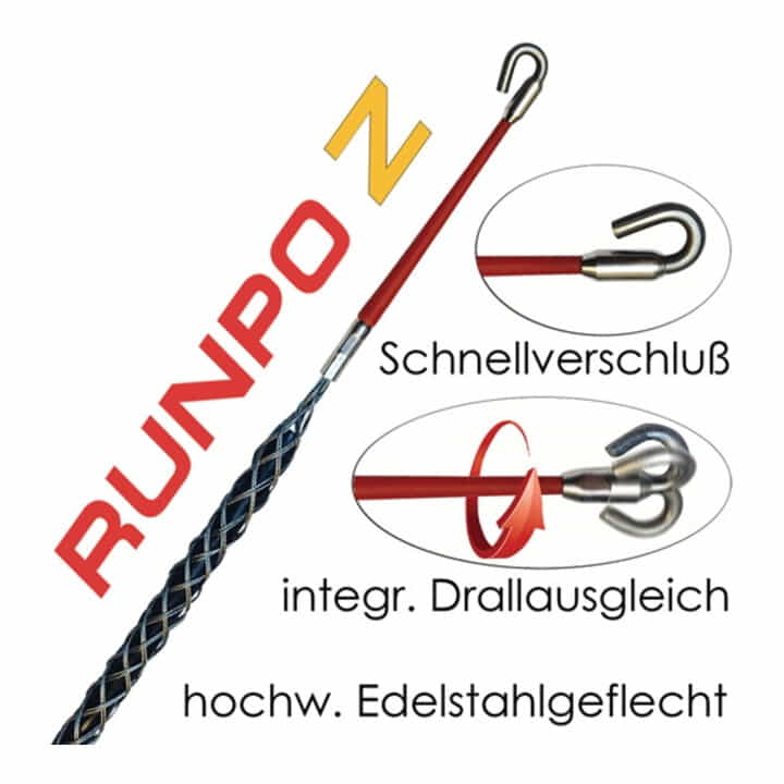 mit Drallausgleich · durch den Schnellverschluss, ein ergonomisch geformter Haken, wird ein sekundenschnelles Anhängen und Einziehen ermöglicht, dadurch ist kein zeitaufwendiges An- und Abschrauben mehr notwendig · der Haken, die Verbindungen und das Ziehstrumpfgeflecht sind aus hochwertigem Edelstahl , dadurch kein Rosten und lange Lebensdauer · das flexible Edelstahl-Doppelgeflecht ermöglicht eine Kabelaufnahme von Ø 9 - 15 mm · statt zwei herkömmlichen Ziehstrümpfen reicht der RUNPO Z
