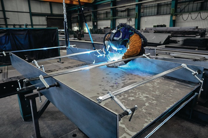 variable high-performance screw clamp with rail made of cold-drawn and galvanised profile - 2 forged tempered steel sliding arms - can be repositioned for spreading without tools - the clamp can be pushed through openings in the workpiece - clamping force up to 6500 N (for clamping widths up to 2000 mm) or 9000 N (for clamping widths of 3000 mm) - heat-resistant 35° swivelling special pressure plate (for clamping widths up to 2000 mm) - with sintered steel insert for clamping widths of 3000 mm