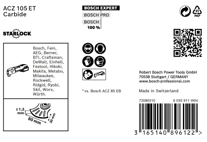 Thanks to Bosch Carbide Technology, the EXPERT Multi Material ACZ 105 ET segment saw blade offers an outstanding service life in abrasive materials and composites. An additional coating makes it even more resistant, with a service life up to 50 times longer than a bi-metal saw blade. The thicker construction of the blade provides additional robustness and stability. This ensures precise and straight cuts. In addition, the Starlock mount ensures maximum power transmission and convenient blade changes within a few seconds and can be used with many machines thanks to the manufacturer-independent mounting system. The Bosch EXPERT range is the most innovative accessory for power tools with proven performance benefits to enable every professional craftsman to work with maximum efficiency. Extremely long service life, maximum precision, working at top speed and dust-free sanding: all this is possible with Bosch EXPERT.