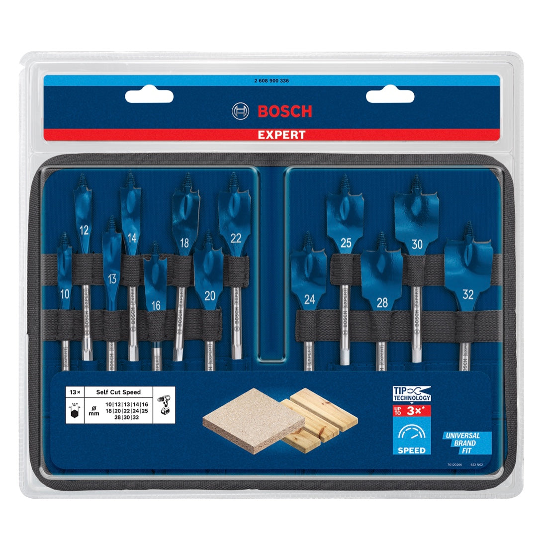 - 13x Bosch EXPERT SelfCut Speed flat milling cutters ( 10 / 12 / 13 / 14 / 16 / 18 / 20 / 22 / 24 / 25 / 28 / 30 / 32 mm )