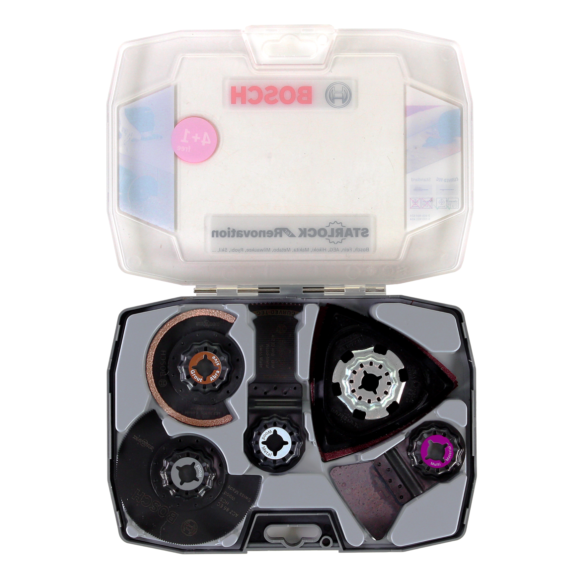 The power tool is designed for sawing and cutting wood-based materials, plastic, plaster, non-ferrous metals and fastening elements (e.g. unhardened nails, staples). It is also suitable for working on soft wall tiles and for dry sanding and scraping small surfaces. Whether plunge cutting, flush sawing, sanding or cutting a wide variety of materials, the Starlock 3D interface for perfect power transmission when working and the oscillation angle totalling 2.8° guarantee fast and clean work progress. In addition to the flexible application options, the Multi Cutter is also extremely compact and lightweight, which guarantees fatigue-free working. For even more precise work, it is possible to adjust the rotation perfectly to the material to be processed using speed selection. The Bosch 12V devices are also compatible with the 10.8V Li-ion batteries from Bosch. This makes the cordless multi-cutter a true all-rounder and the brushless EC motor makes the tool very powerful and durable. The matching Starlock set is suitable for numerous renovation jobs. The 5-piece accessory set is compatible with all Starlock, Starlock Plus and Starlock Max power tools as well as all standard multi-function tools. The Starlock mounting system enables a quick blade change in three seconds without touching the blade. The Starlock mounting system enables maximum power transmission between the machine and accessory thanks to its three-dimensional tight fit. The selection of high-quality materials and their processing ensure a long service life for the set. The tool is stored in a practical plastic box for safe transport.