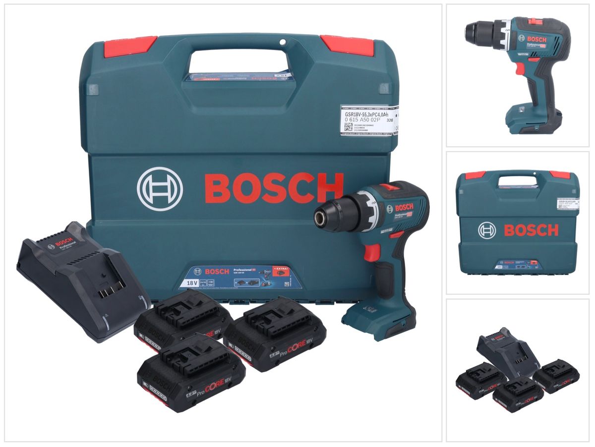 Bosch GSR 18V-55 Professional cordless drill driver 18 V 55 Nm brushless ( 0615A5002P ) + 3x ProCORE rechargeable battery 4.0 Ah + charger + L-case
