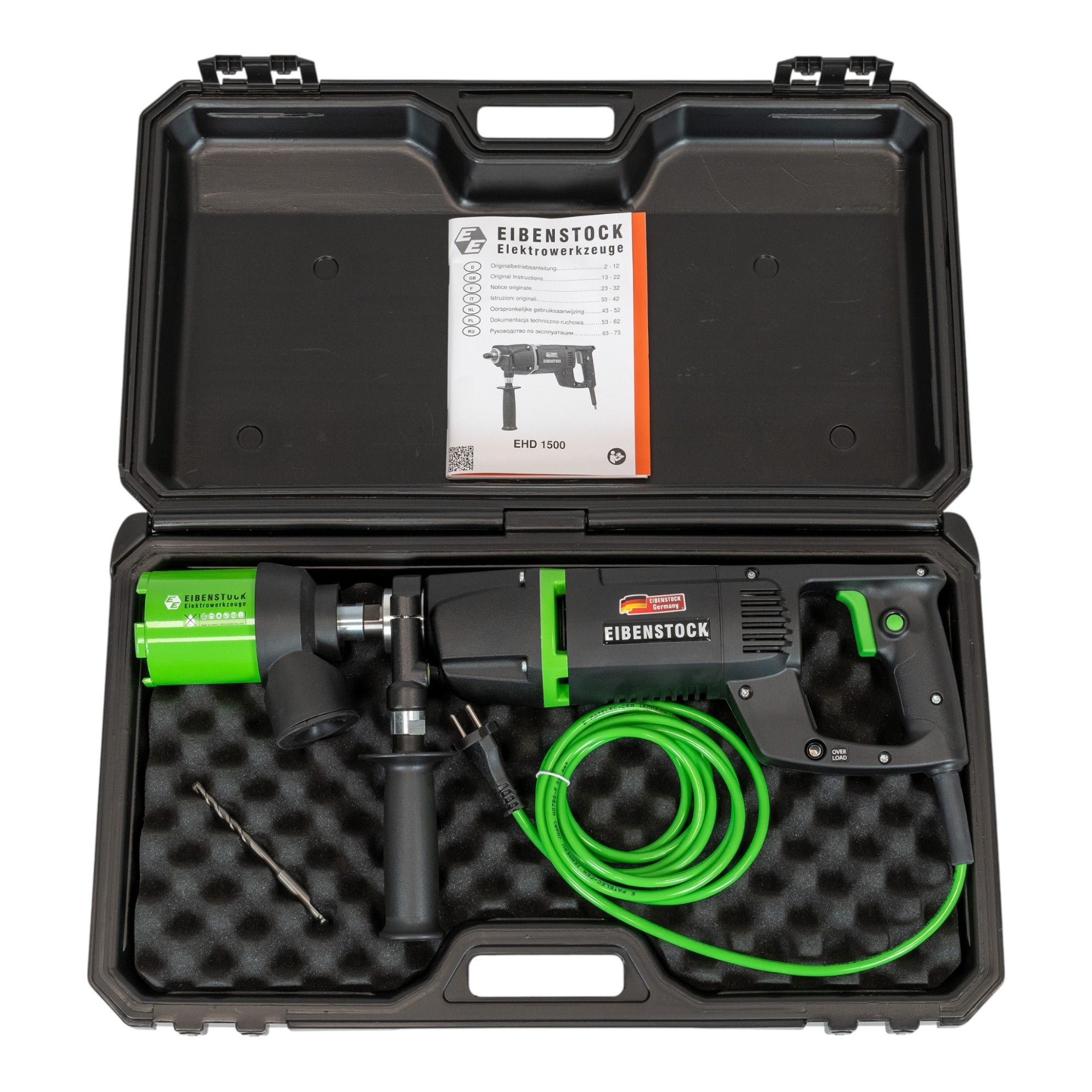 The Eibenstock EHD 1500 Set Diamond Dry Core Drill is a compact and powerful solution for dry drilling in hard materials such as limestone, clinker, brick and other abrasive materials up to a diameter of 82 mm. It is ideal for creating box cuts, for example for switch and junction boxes in electrical installations. The machine is equipped with modern electronics that include a soft start and temperature and overload cut-out to prevent overload and extend the service life of the machine. In addition, the overload indicator shows when the machine is under excessive load, making work safer. A mechanical safety clutch provides additional safety by reacting immediately in the event of blockages or unexpected loads. Despite its high performance, the EHD 1500 Set remains easy to handle thanks to its low weight and enables fatigue-free working even during longer periods of use. The PUR construction site cable is particularly durable and ideal for heavy-duty use on construction sites. The ergonomic handle and large switch button also offer excellent control and contribute to a comfortable and safe working experience.