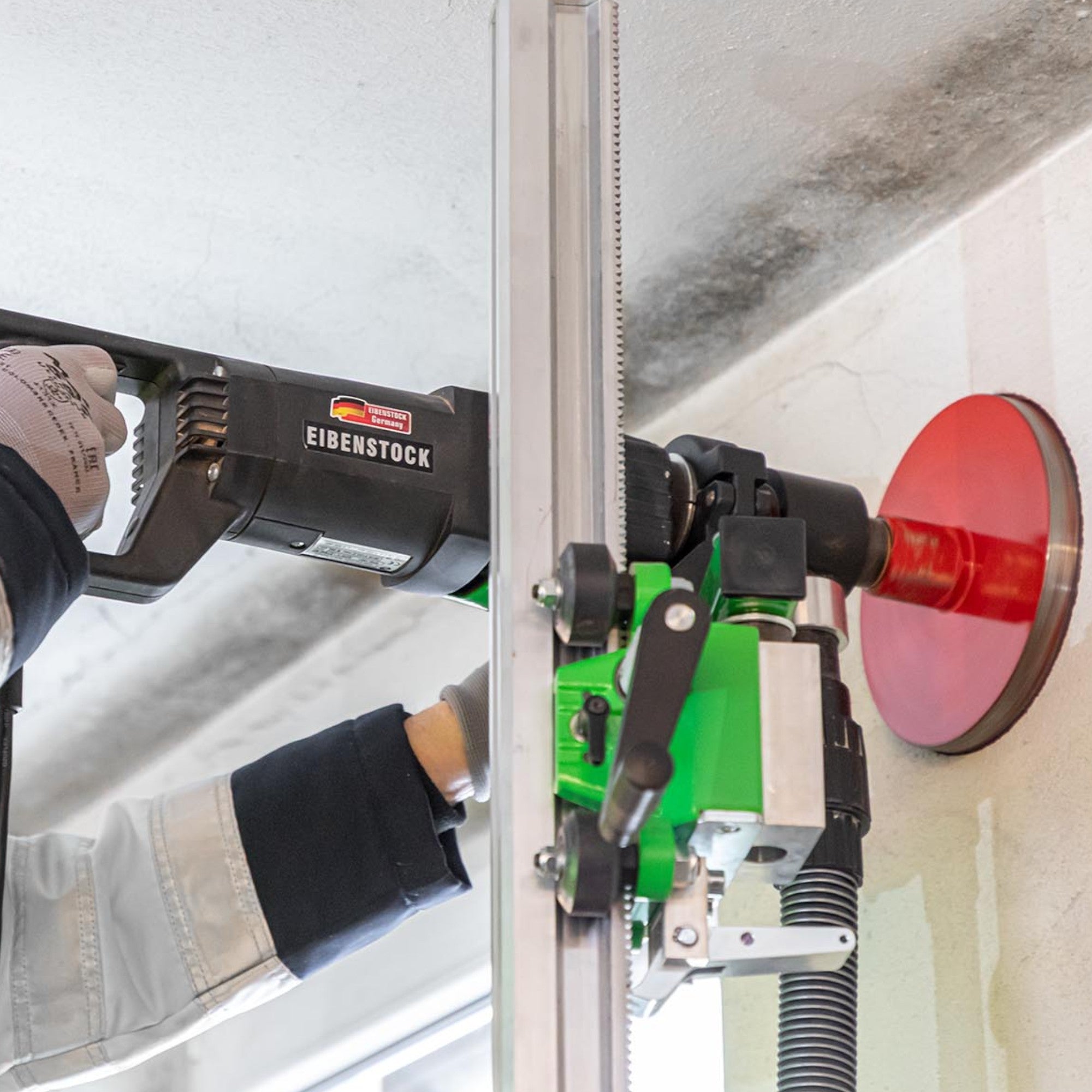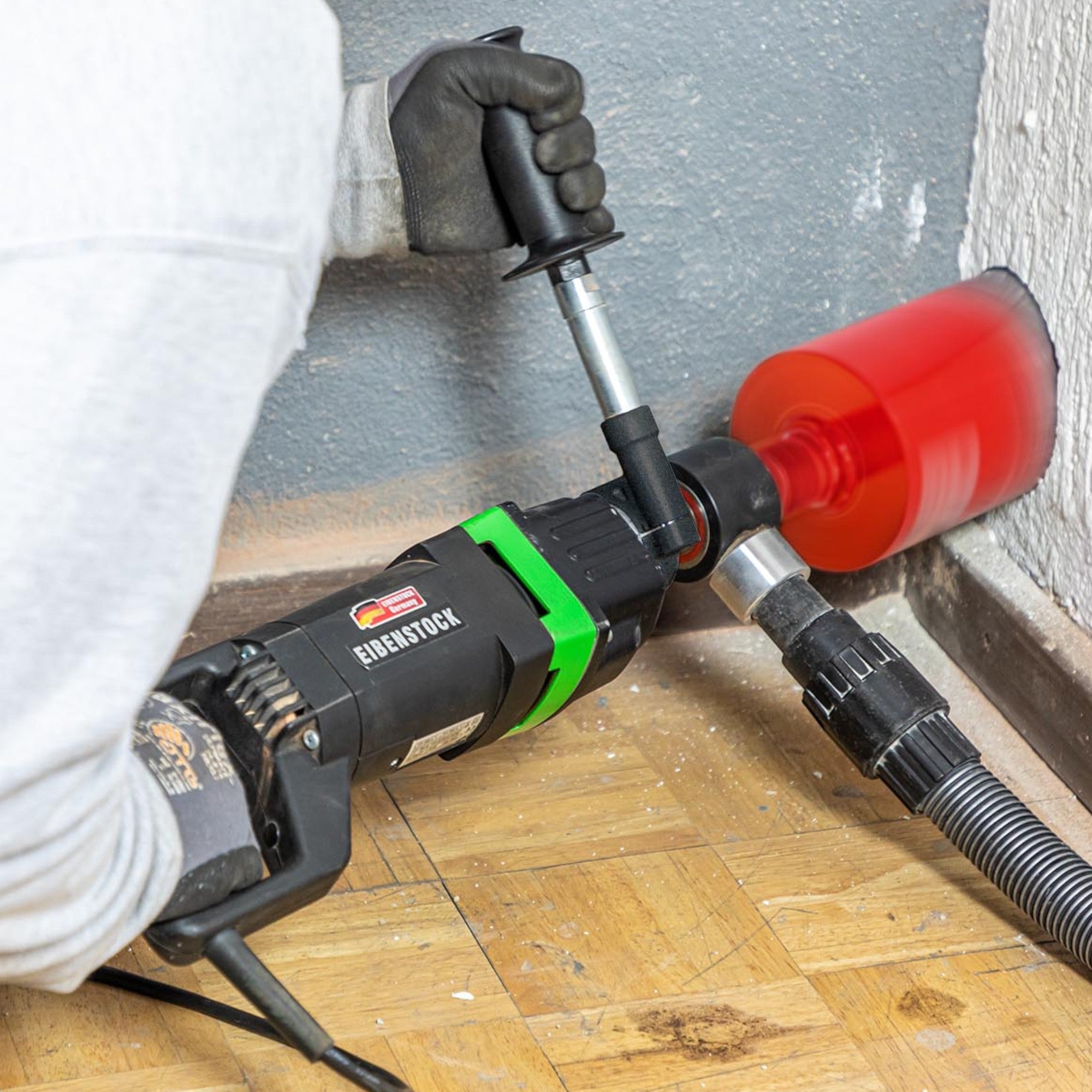 The Eibenstock EHD 1801 diamond dry core drilling machine is a powerful tool designed for dry drilling in large bore diameters up to 250 mm in hard materials such as sand-lime brick, masonry, clinker, brick and ceramics. It is perfect for connection drilling in chimney and heating construction as well as for making wall and ceiling openings in sanitary, heating and ventilation construction. The powerful motor ensures fast and precise work, while the electronics with functions such as soft start, temperature and overload cut-out ensure a long service life and additional safety. The oil bath gearbox guarantees optimum lubrication and contributes to the machine's longevity, while the robust metal gearbox ensures high resistance. A mechanical safety clutch protects against sudden overloads and ensures safe operation. The variably adjustable additional handle on the clamping neck allows convenient handling and precise guidance of the machine, while the compact design ensures that the EHD 1801 is both handy and well-balanced to offer maximum precision and control even in difficult working areas.