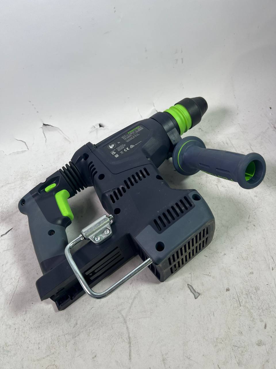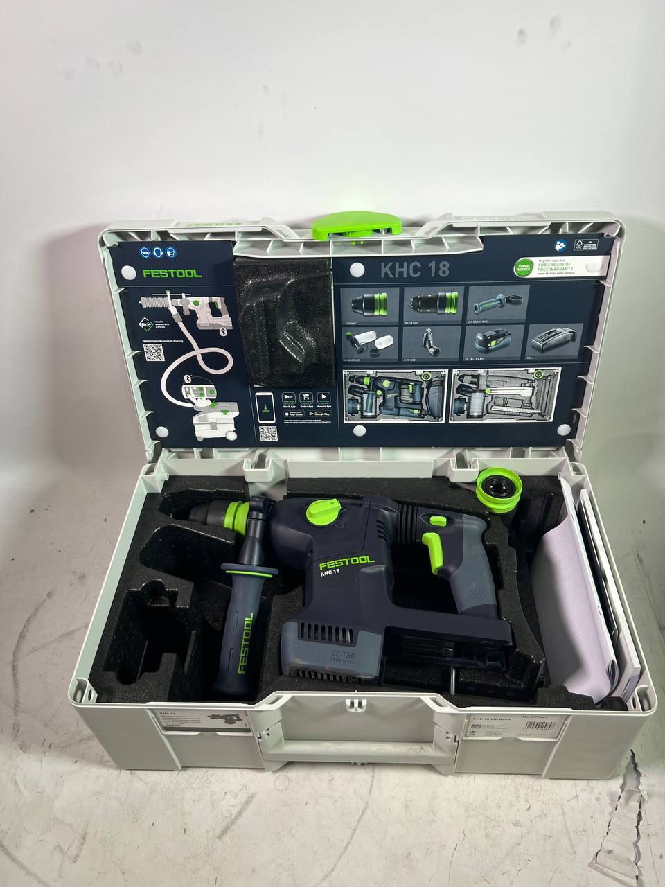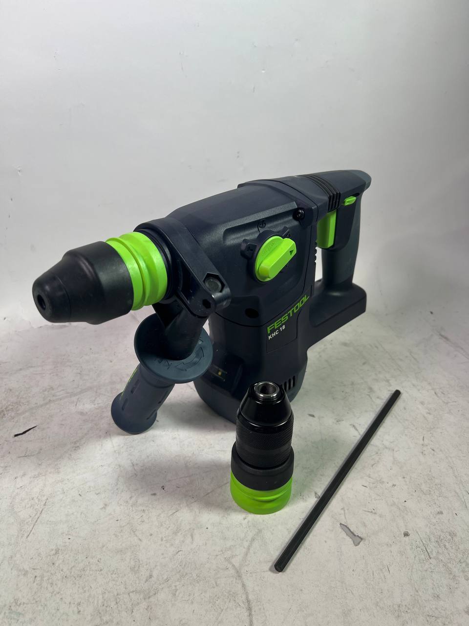 The Festool KHC 18 EB cordless combihammer is a powerful all-rounder for a wide range of applications. With its powerful brushless EC-TEC motor and pneumatic impact mechanism, it delivers 2.6 joules of impact energy for fast drilling progress and good removal rates when chiselling. The combihammer is versatile and can be used for hammer drilling, chiselling and drilling without impact. The ability to change the direction of rotation for driving and removing screws also makes it ideal for these tasks. Thanks to the SDS-Plus and quick-release drill chuck, the combi hammer can be used with a wide range of tools. Practical features such as the depth stop for precise adjustment of the drilling depth, the LED light for optimum visibility and the scaffolding hook for secure attachment make working with the tool convenient and efficient. The optional extraction unit is suitable for every application and integrates seamlessly into the clever Festool extraction system with mobile extraction unit. The electronic KickbackStop, which minimises the risk of injury in the event of a sudden jamming of the drill bit, and the switch-on lock, which prevents the machine from starting up unintentionally, ensure increased safety. The Festool KHC 18 EB cordless combihammer can be used to drill holes up to Ø 18 mm in concrete, stone and masonry, as well as for light chiselling work such as chipping off plaster, filler or tiles. The various application options make it ideal for tradesmen and DIY enthusiasts who need a reliable and versatile tool.