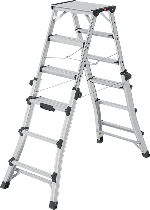Aluminium - telescopic stepladder for flexible working heights - climbing and support stiles adjustable to 2 x 4, 2 x 5 or 2 x 6 steps - can be accessed from both sides - step/rung combination with non-slip, ribbed tread surface - can be used on stairs, max. step adjustment 430 mm - space-saving - max. total load 150 kg