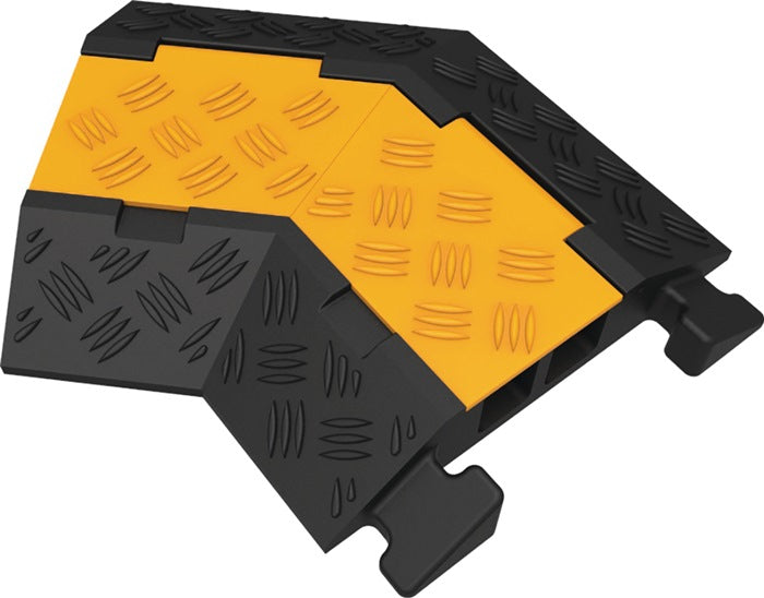 with two ducts - to protect hoses or cables that are not permanently laid - dimensions of cable ducts H 32 x W 30 mm - no fixing required - made of black vulcanised solid rubber and non-slip surface - with yellow protective cover and carrying handle - can be driven over up to an axle weight of 8 t - endless mounting with spigot/groove system