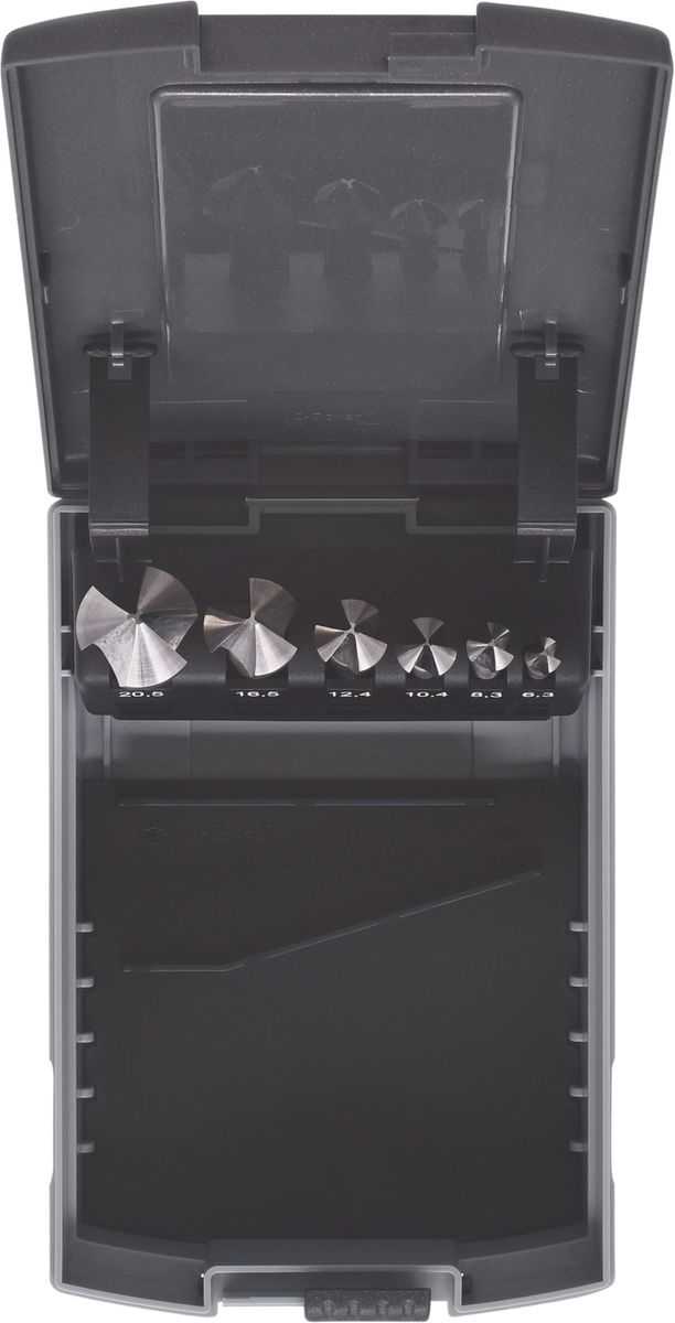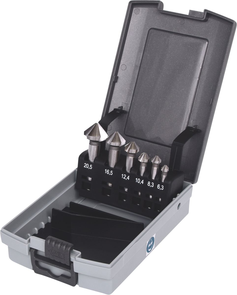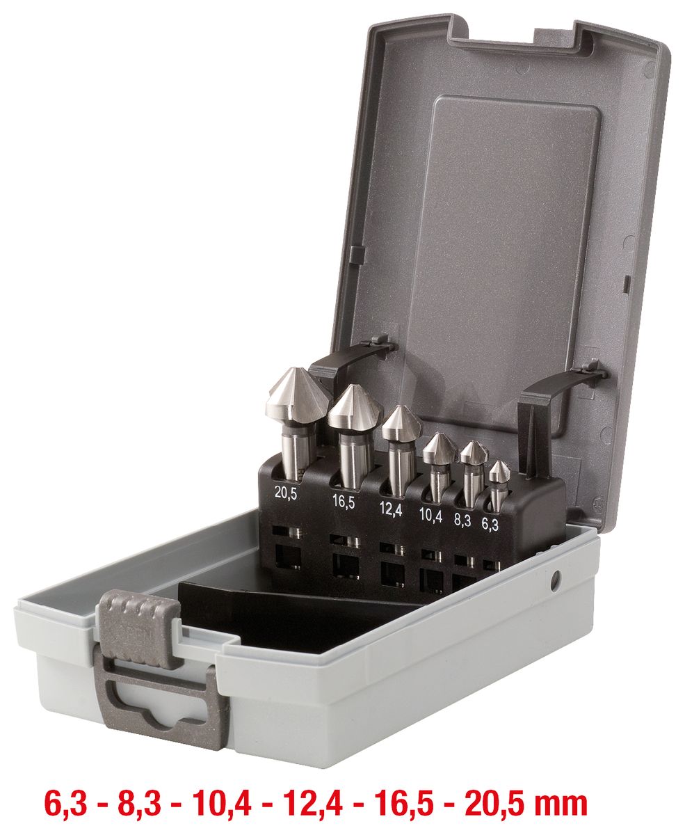 HSS Kegel- und Entgratsenker-Satz, Kunststoffkassette 6-tlg · HSS Kegel- und Entgratsenker-Satz 90° in Kunststoffkassette
