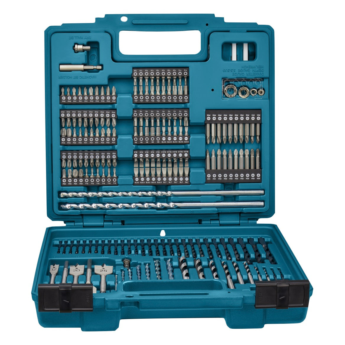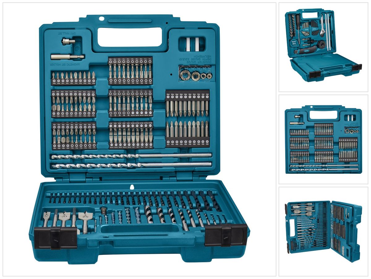 The 256-piece Makita bit & drill set offers a comprehensive range of equipment for all kinds of applications. From masonry, wood, metal and flat milling drills, as well as a 130-piece bit set in lengths of 25 mm and 50 mm, to a 20-piece socket spanner set, this case also offers everything a DIY enthusiast could wish for. Thanks to the clear arrangement, everything can be found quickly and easily. Thanks to the 256-piece bit & drill set, there is no more unsorted collections of bits and drills. Makita is a leading manufacturer of power tools and hand tools, and the company is characterised by high quality controls and manufacturing standards.