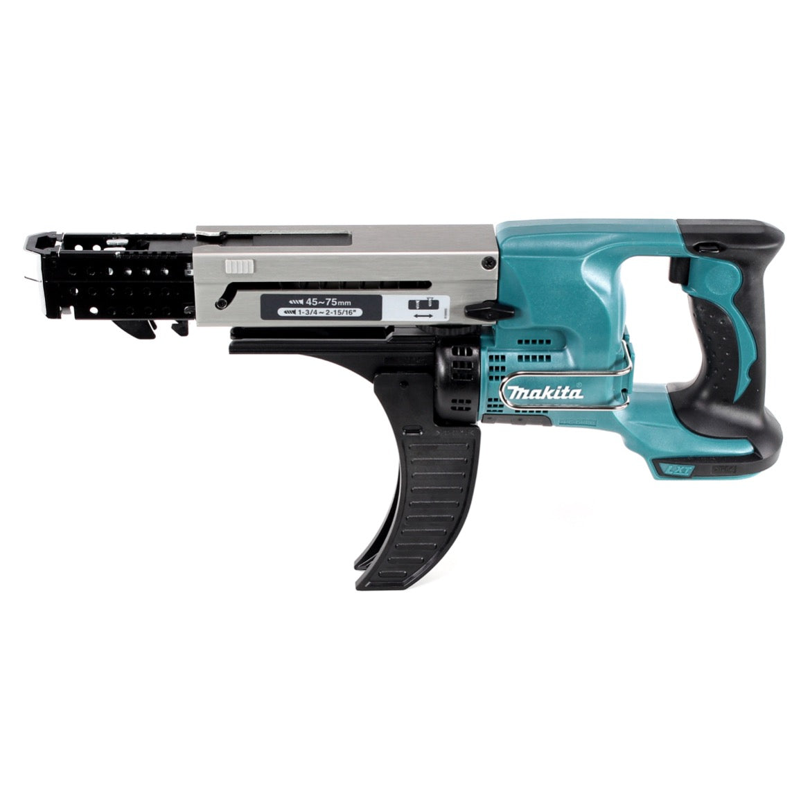 Der Makita DFR 750 Z überzeugt durch einen 4-poligen Motor in kompakter Bauform ohne Drehmomentverlust bei geringer Stromaufnahme. Der DFR 750 Z verfügt über eine geräuschlos abschaltende Kupplung sowie ein Rechts-/Links-Lauf. Der einstellbare Tiefenanschlag eignet sich für unterschiedliche Schraubenlängen und zur schnellen Verarbeitung von gurtmagazinierten Schrauben. Die lange Schraubenführung verhindert das Verkanten des Gurtes und die hohe Drehzahl sorgt für einen effektiven Arbeitsfortschritt.